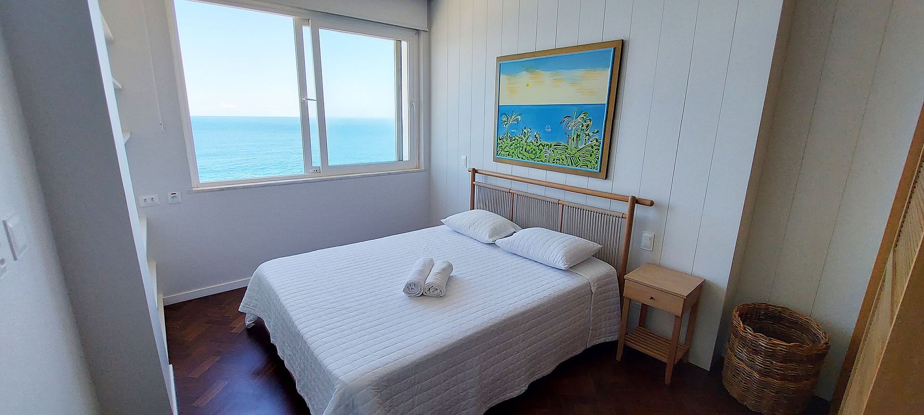 - DORMITORIO 2 - SUITE VISTA AL MAR - 1 cama queen, armario, 1 mesita de noche, cortina blackout, aire acondicionado split, baño con lavabo, espejo, closet, box, ducha eléctrica
