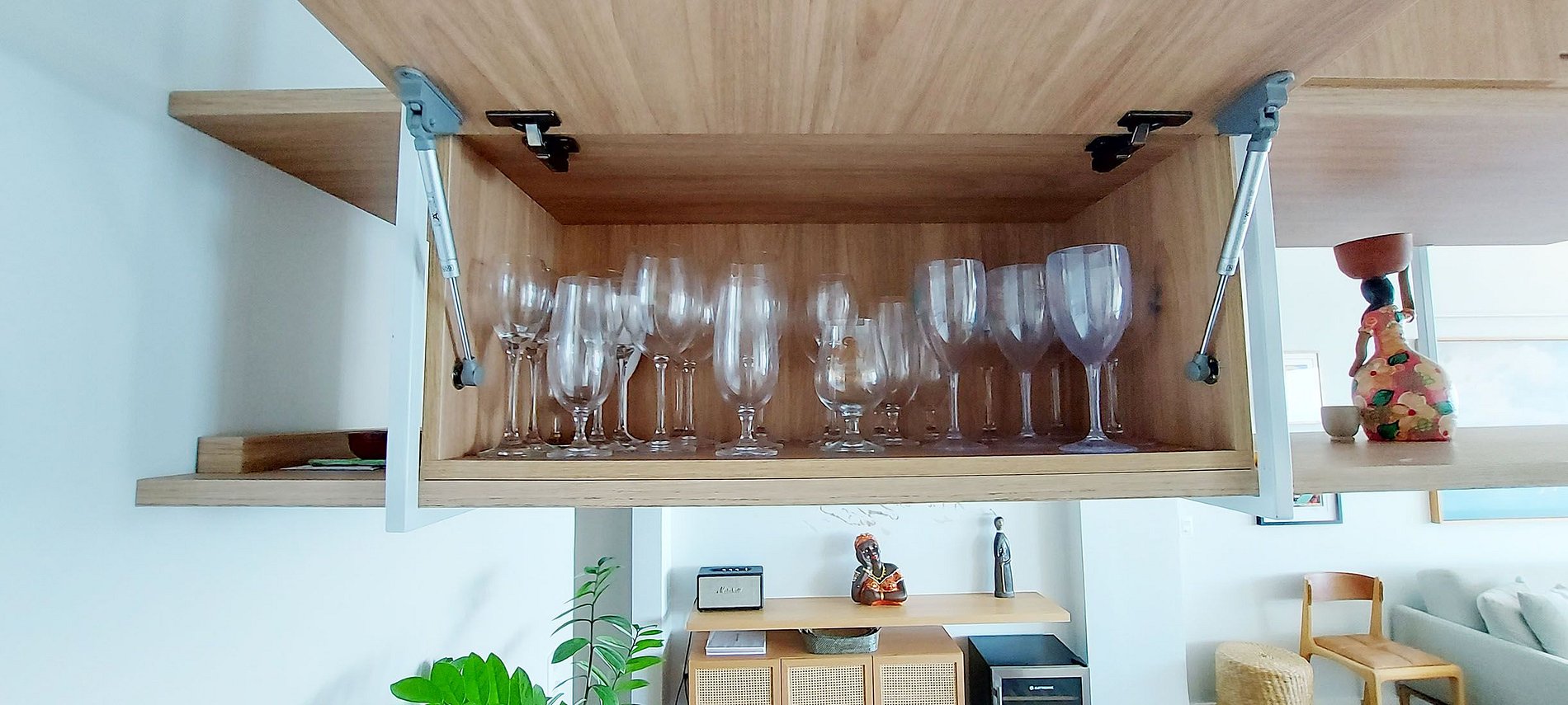 - Salón + comedor: estante de madera, altavoz Marshall, mini bodega, cesta de mimbre, sofá grande de 5 plazas, 2 hamacas, 1 recamier de madera, maceteros, banco de madera con 2 bancos y ventana con vista completa al mar, mesa grande de madera. con 6 sillas, rack de madera con parlante, TV Box, smart TV gigante incorporado, WI-Fi, 2 aires acondicionados split