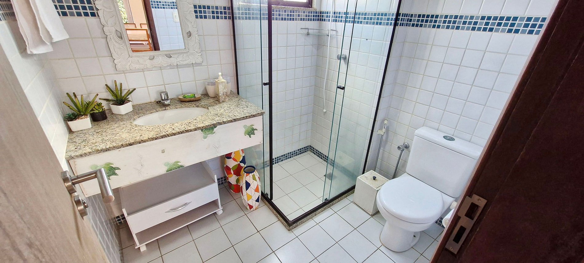 - Lavabo y espejo grande, ducha con bidé, ducha eléctrica y mampara de cristal.