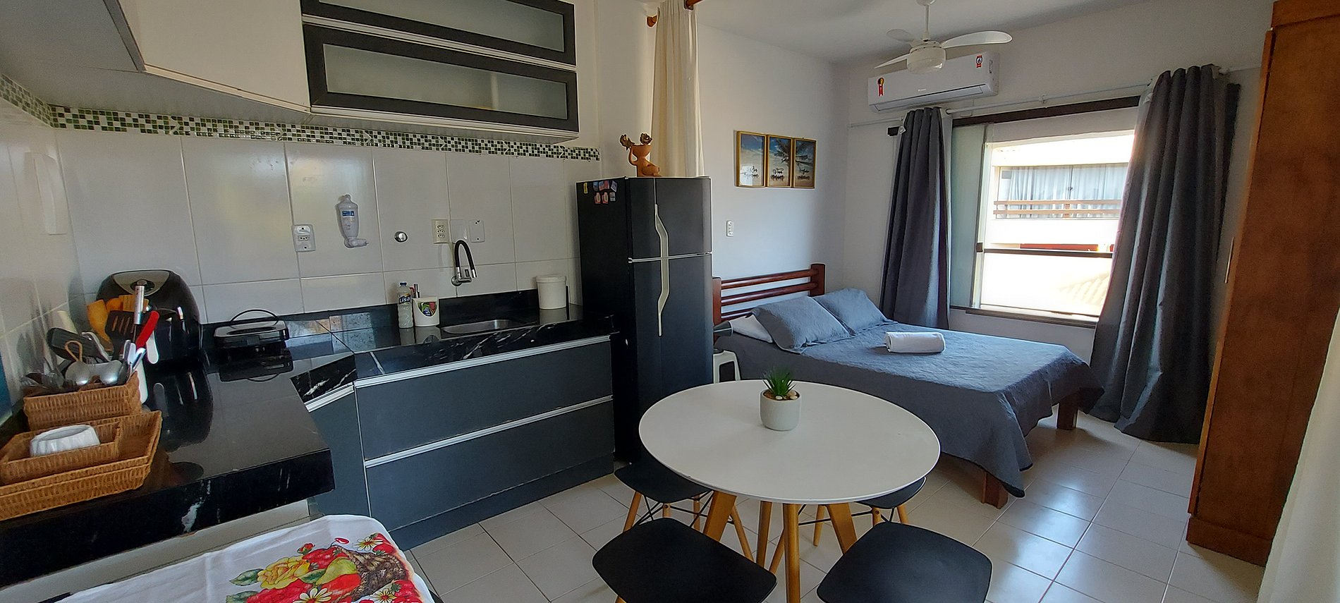 - Dormitorio con cama matrimonial, armario, SMART TV 32" (sin canales locales), aire acondicionado split 18.000 BTU, ventilador de techo, cortina blackout, ventana con vista al mar, cortina que divide la habitación