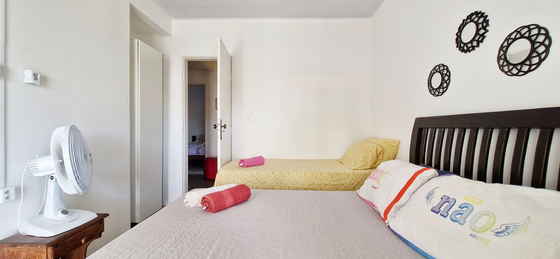 DORMITORIO 2 (con balcón): cama doble, cama individual, cortina opaca, ventilador de mesa, armario, balcón con hamaca