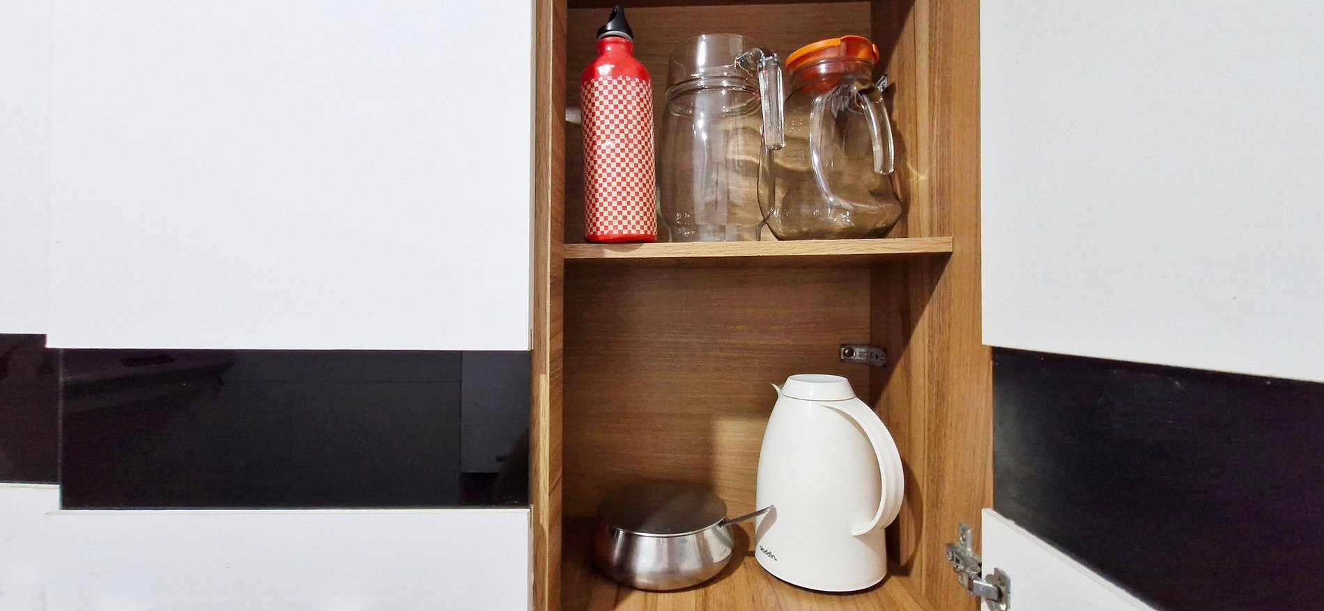 COCINA: Cocina de 4 fuegos, purificador de aire, microondas, airfryer, licuadora, sandwichera, cafetera eléctrica, nevera, sartenes, ollas, termos, cubiertos, vasos, cuencos y accesorios de cocina.