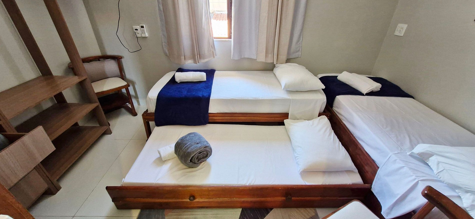 - SUITE (3 personas): 1 litera individual con cama supletoria, 1 cama individual, 2 sillas, armario, aire acondicionado split, ventilador de techo, smart TV (apps y canales locales), plancha, cortina blackout. BAÑO con lavabo, espejo, bidet, ducha y ducha eléctrica.