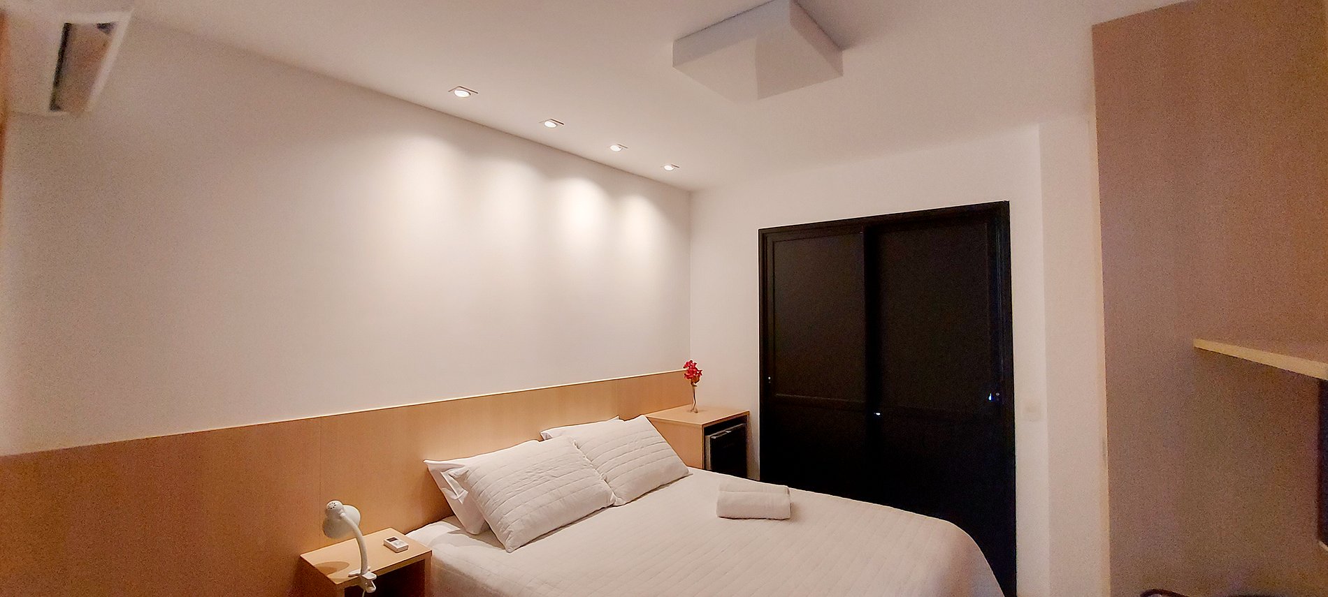 - Suite con cama queen, 2 mesas esquineras, lámpara, aire acondicionado split, TV con canales locales, puerta del balcón diseñada para bloquear la luz exterior
