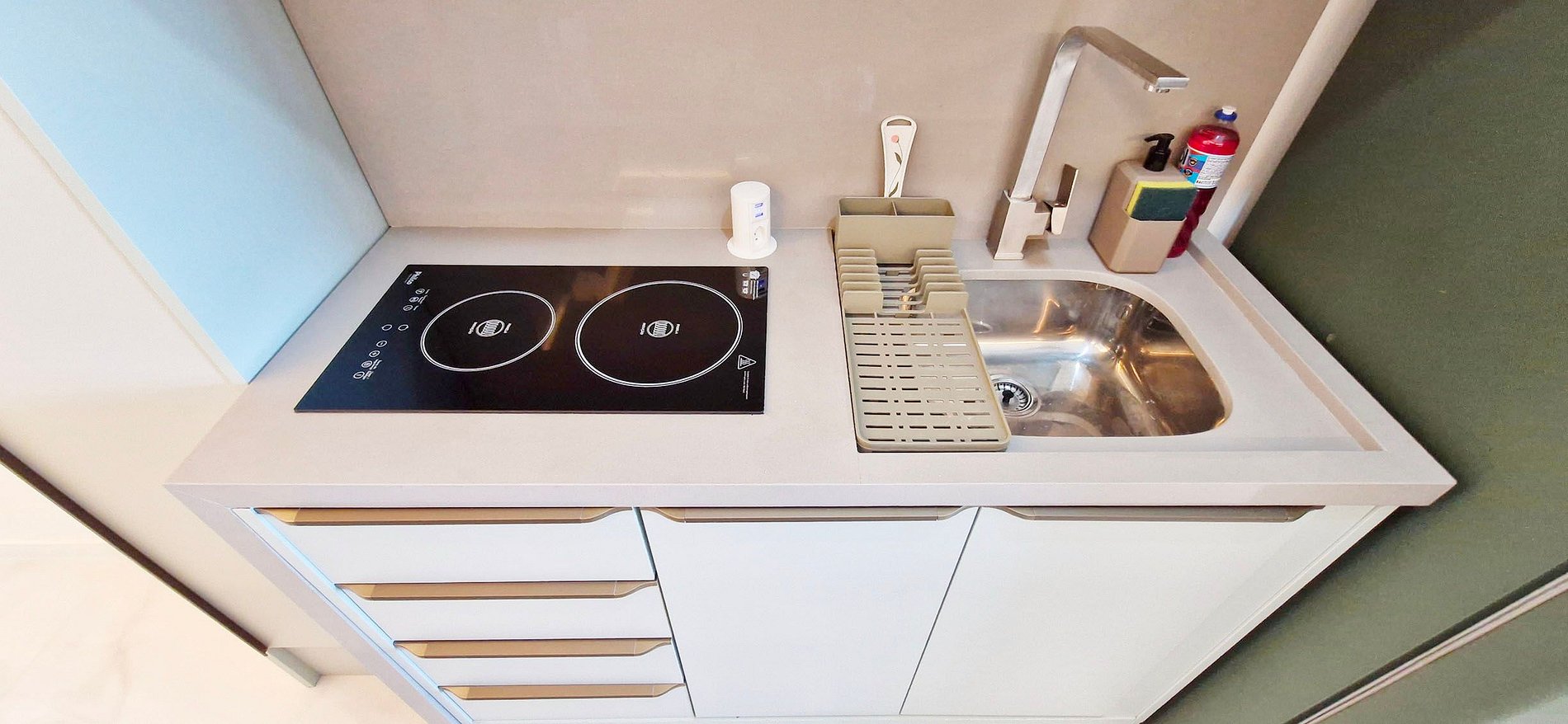 - COCINA: encimera con 2 taburetes altos, frigorífico duplex, sandwichera, termo, licuadora, microondas, placa de inducción de dos quemadores, filtro de agua, sartenes, cubiertos, vasos y accesorios de cocina variados.