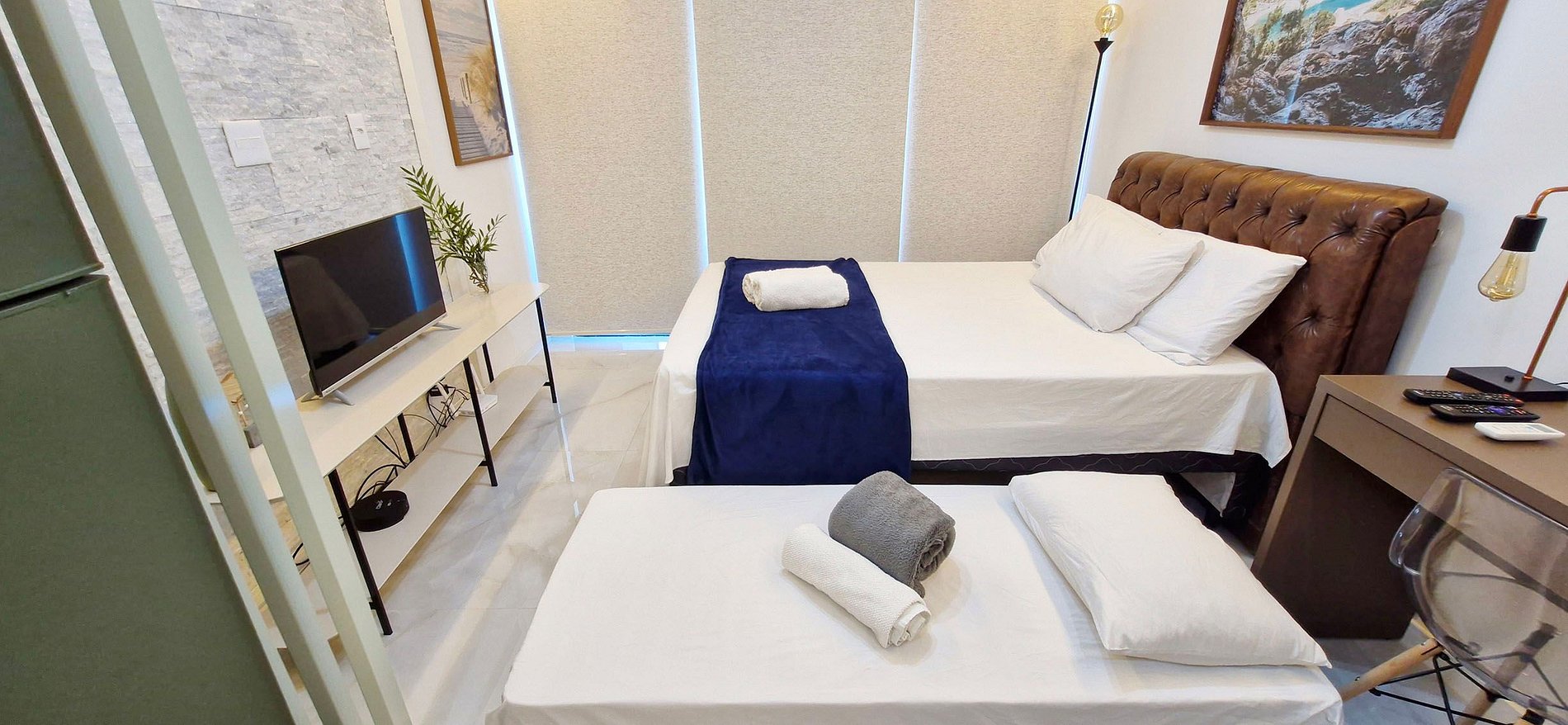 - SUITE: cama de matrimonio, cama supletoria individual, armario, gran espejo, escritorio con silla y lámpara, smart TV (apps y TV abierta), WI-FI, aire acondicionado split, cortina blackout, luz LED. BAÑO: mueble, espejo, ducha eléctrica, plancha.