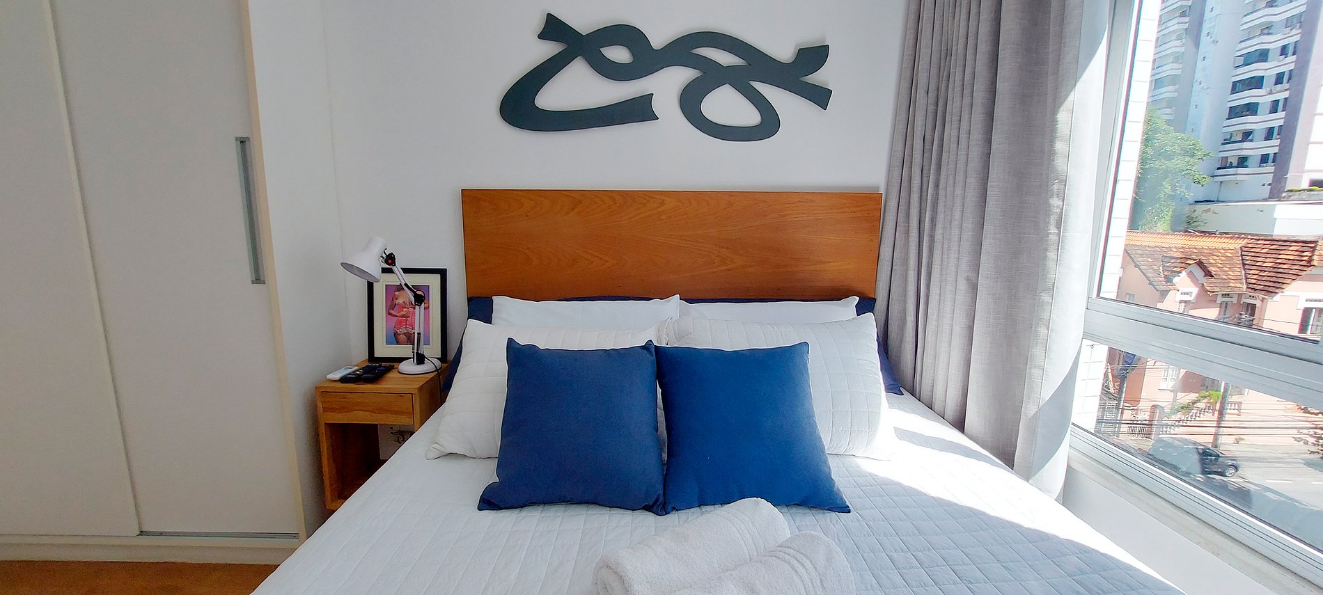 - Dormitorio con cama doble, mesa de rincón con lámpara, aire acondicionado split, ventilador de techo, smart TV con canales abiertos, armario, cortinas blackout, elementos decorativos