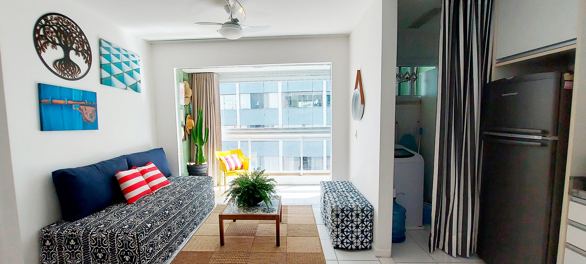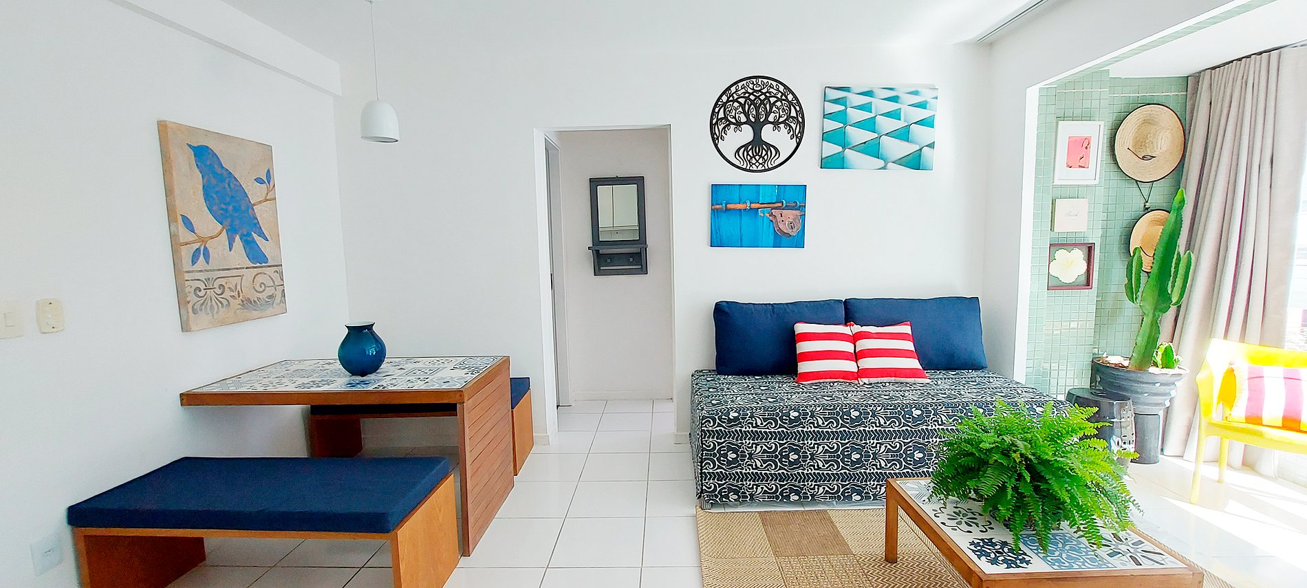 - Salón con sofá cama doble, mesa ratona, espejo redondo, cuadros decorativos, alfombra, mesa con dos bancos de madera, 2 puffs, ventilador de techo
