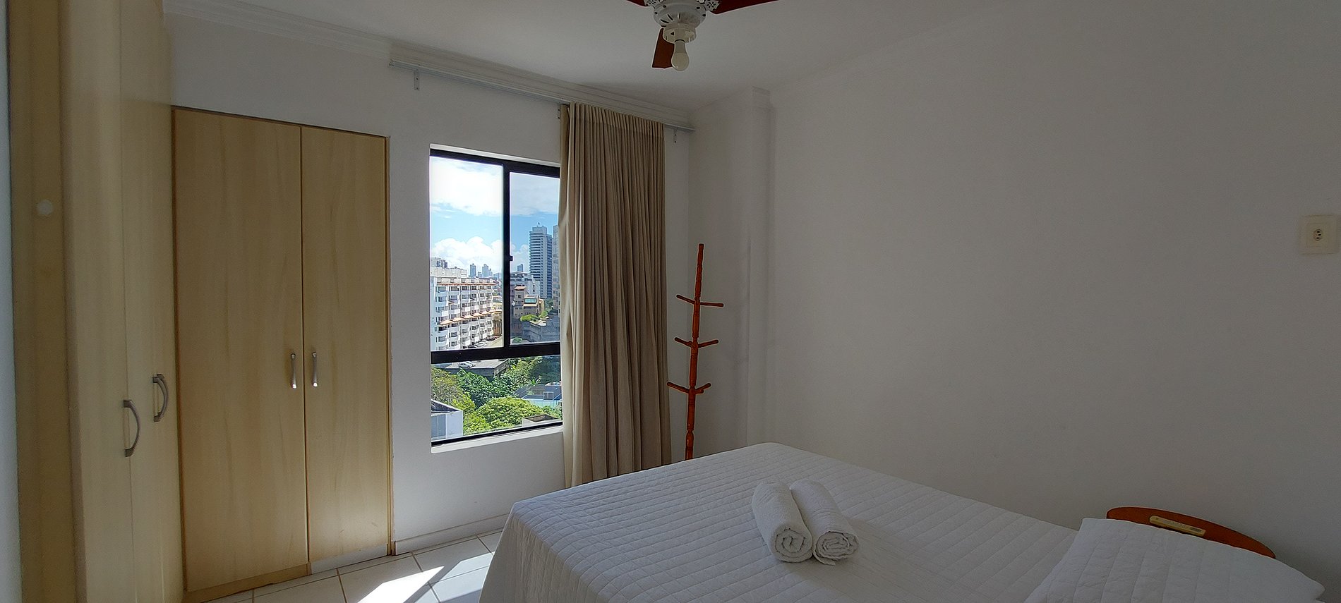 - Dormitorio con cama doble, armario, aire acondicionado split, ventana con cortina blackout, ventilador de techo, tendedero, mesa rinconera, plancha y tabla de planchar.