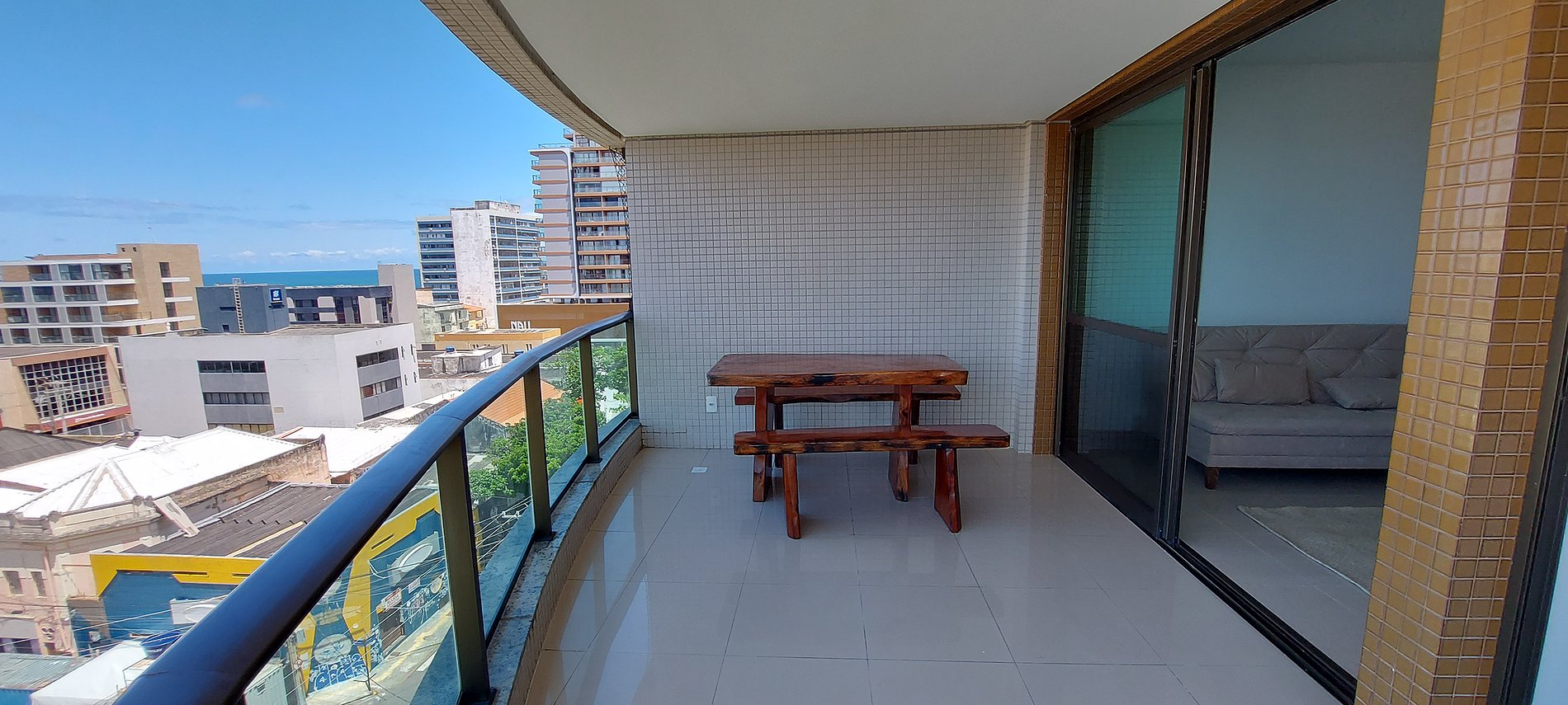 - Balcón con vista completa al mar, mesa de madera con 2 bancos.