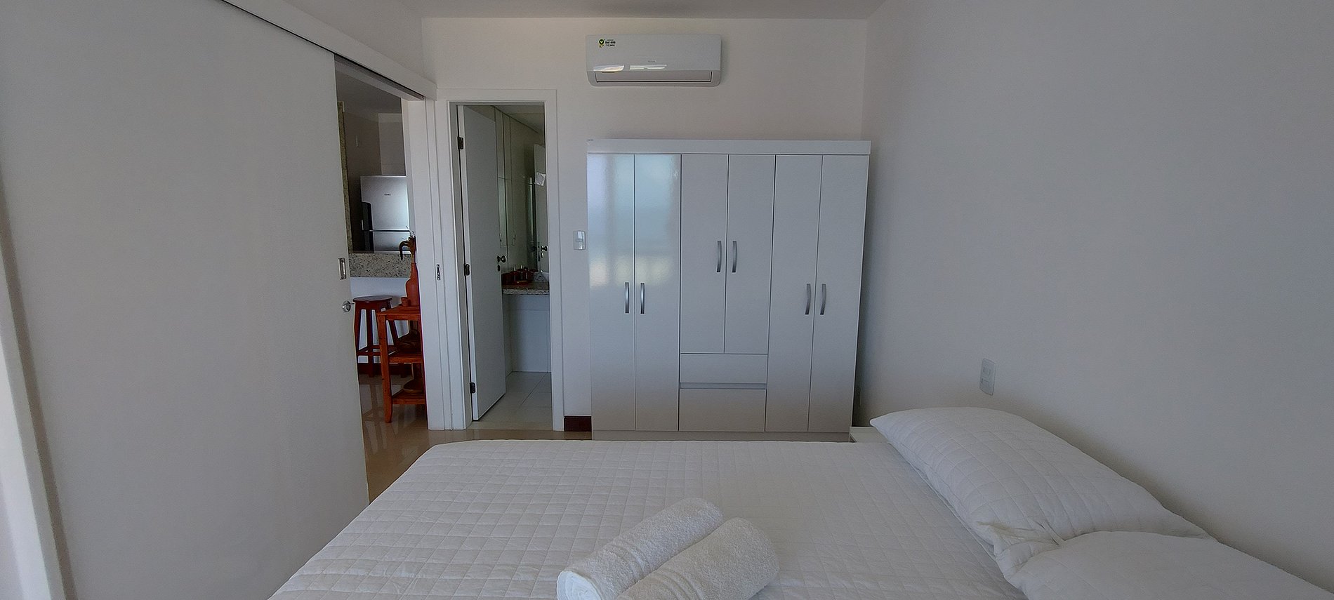 - Dormitorio con cama matrimonial, 2 mesas esquineras, armario, aire acondicionado split, cortina blackout.