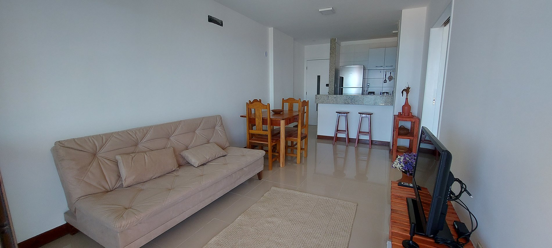 - Salón con mesa de madera y 4 sillas, alfombra, sofá cama, estante con TV con canales locales (no smart TV), WI-FI, mesa rinconera.