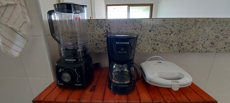 - Cocina completa con filtro de agua, licuadora, cafetera eléctrica, sandwichera, cocina de 4 fuegos, refrigerador duplex, microondas