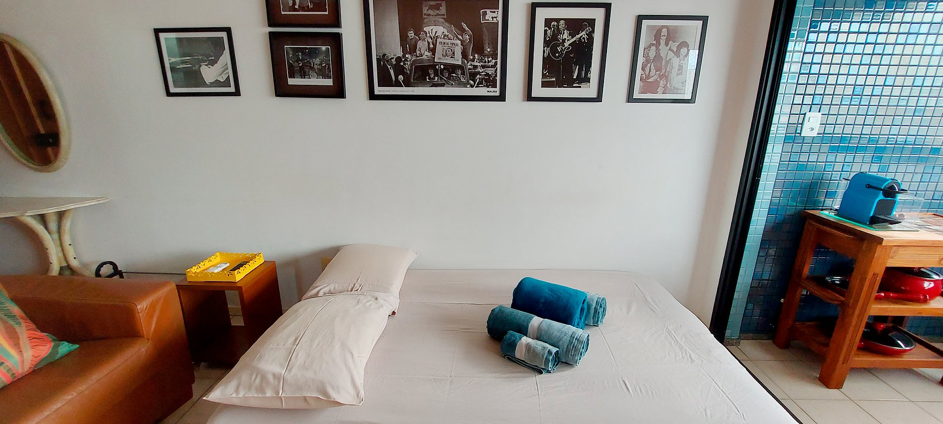 - Salón con espejo y mesa de mármol, sofá de 2 plazas, sofá cama individual o doble (ver fotos del mismo abierto antes de reservar, para valorar comodidad), mesa rinconera, 2 pufs, dos estanterías con libros y objetos decorativos, perchero de madera , TV con Chromecast (refleja tu celular en el televisor) y canales locales (No es un smart TV), WI-FI, parlante para celular o computadora, cuadros de íconos del rock