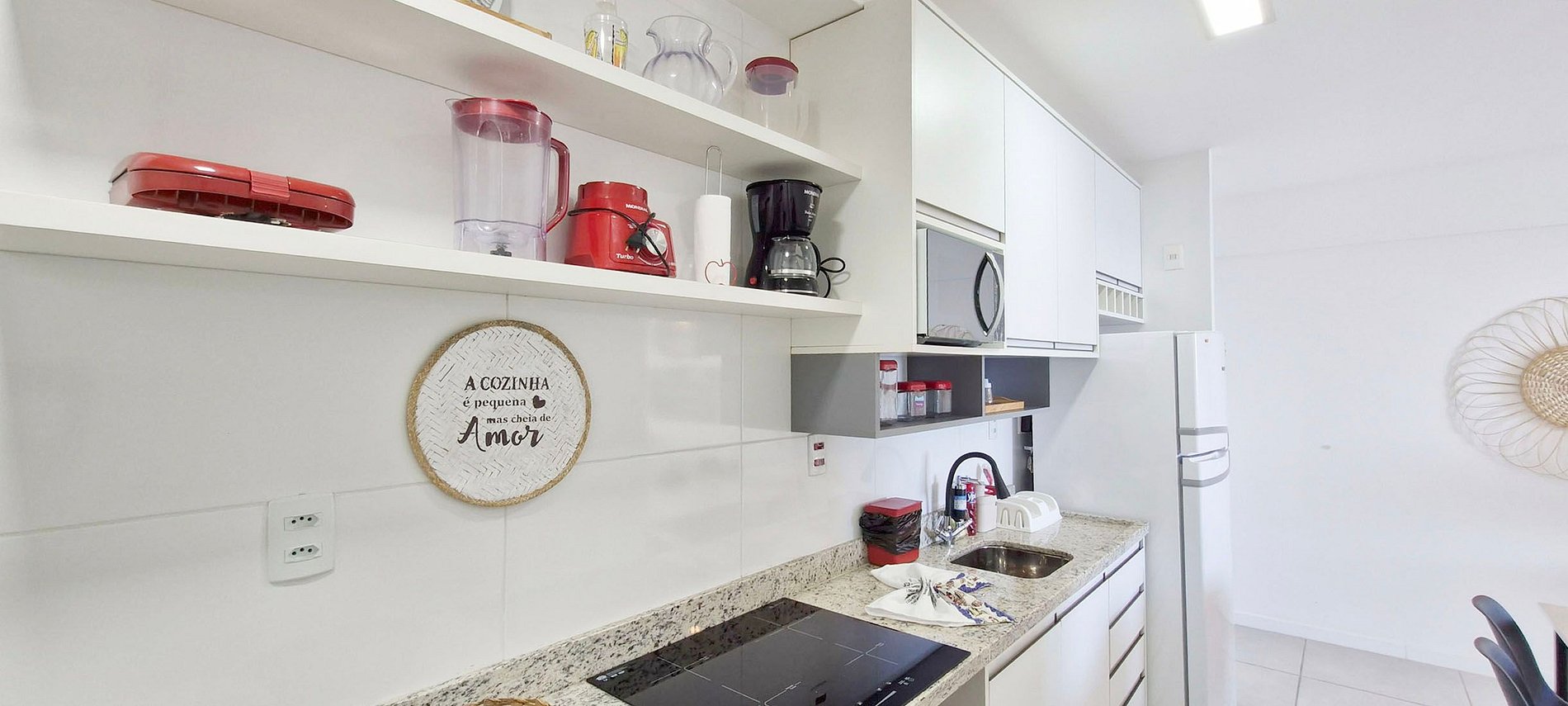 - Cocina con placa de inducción, horno eléctrico, refrigerador de dos puertas, microondas, licuadora, sandwichera, cafetera eléctrica, filtro de agua, vasos, tazas, ollas y accesorios de cocina.