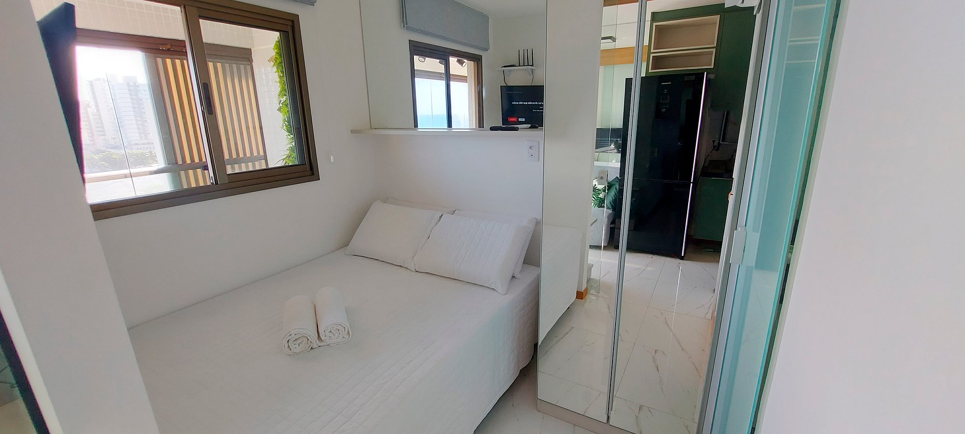 Quarto e sala com vista mar, novo e bem decorado no Costa Azul! Com cama casal, smart TV na sala e no quarto, sofá-cama casal (veja as fotos dele aberto antes de reservar), ar condicionado split e cozinha completa. Condomínio com portaria 24hs, academia, piscina e lavanderia (paga à parte).