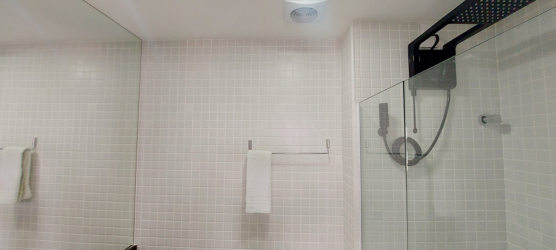 - Banheiro com chuveiro elétrico, box de vidro, pia com espelho e armário