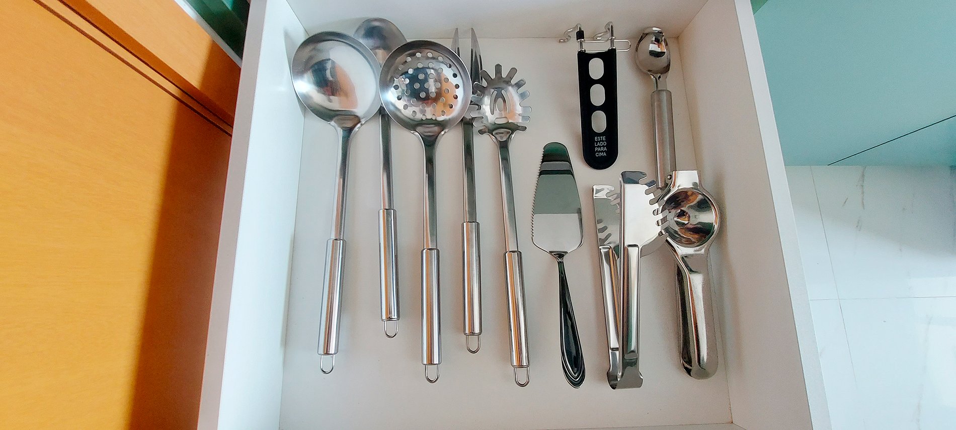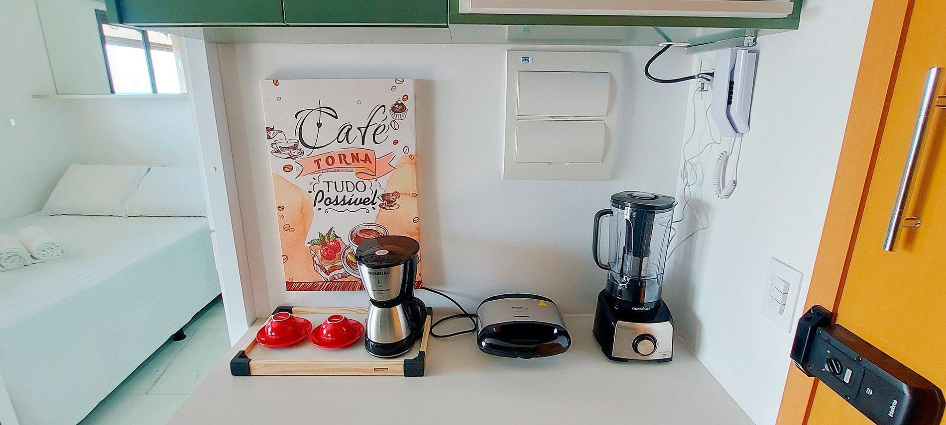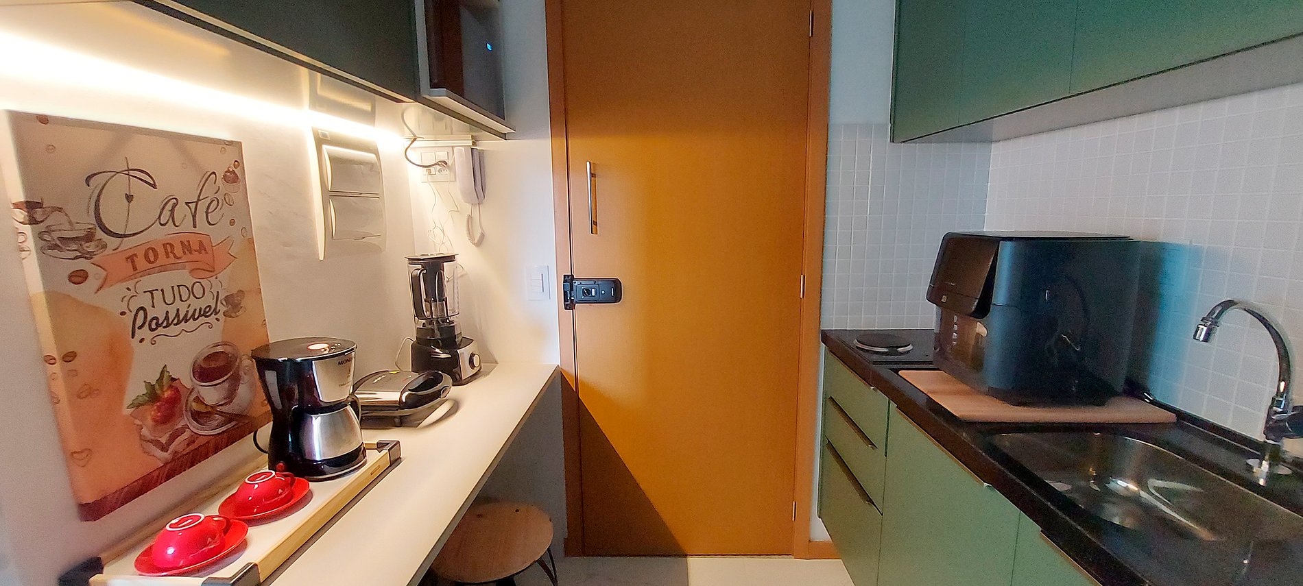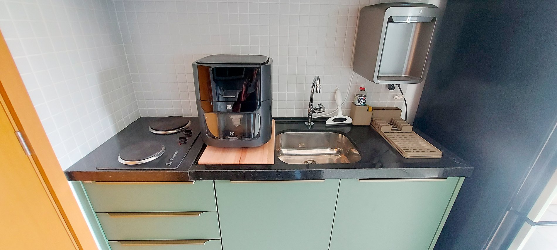 - Cozinha completa com geladeira duplex, cooktop com 2 bocas, filtro de água, bancada com dois banquinhos, cafeteira elétrica, microondas, sanduicheira, liquidificador, airfryer (importante manter a tábua de madeira embaixo dele ao utlizar para evitar aquecimento) e itens básicos de cozinha.
