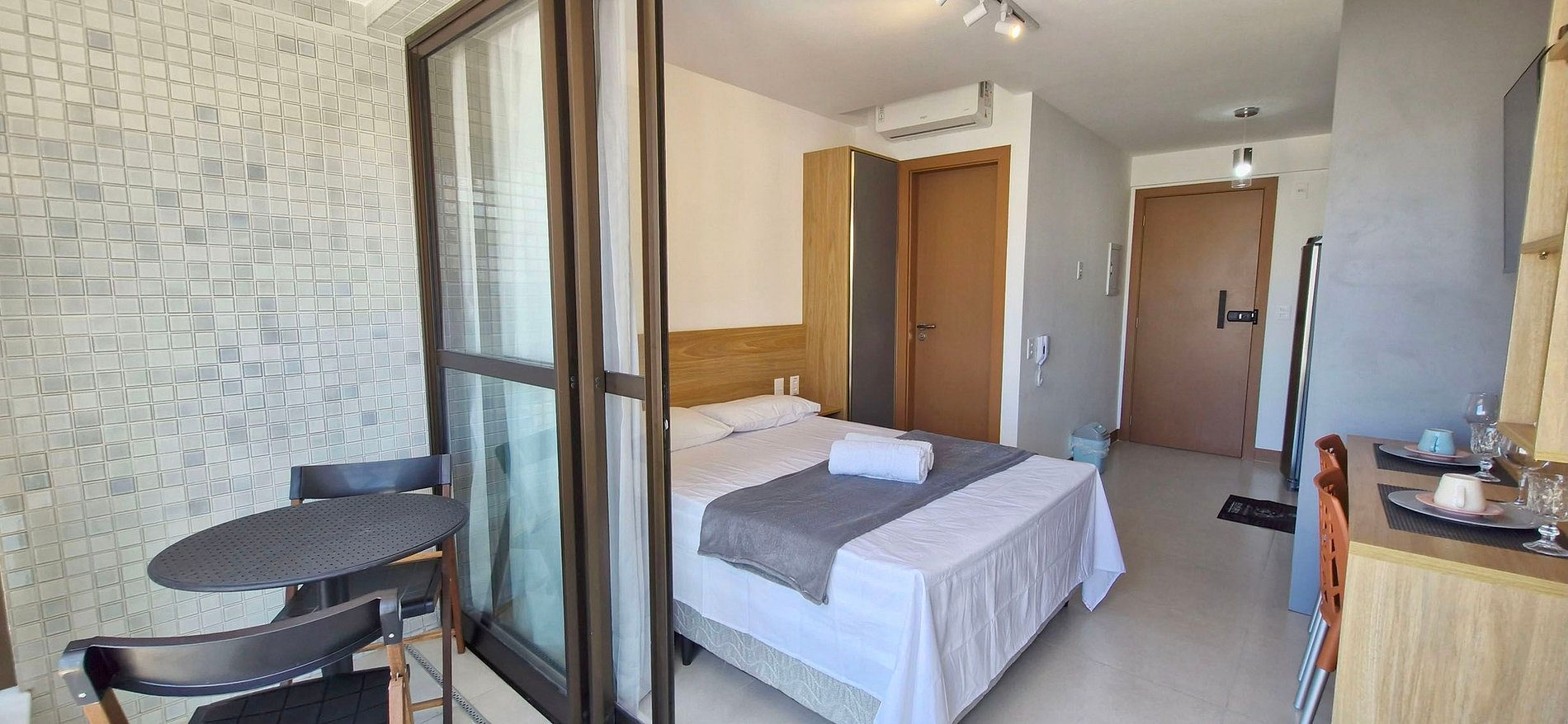 - Espaço com cama casal, guarda-roupa, ar condicionado split, janela com cortina blackout, smart TV com canais locais, WI-FI, bancada com duas cadeiras, ferro de passar.