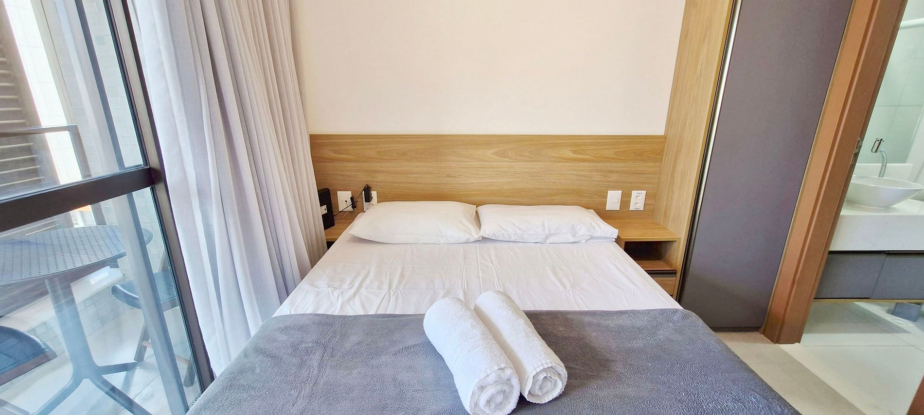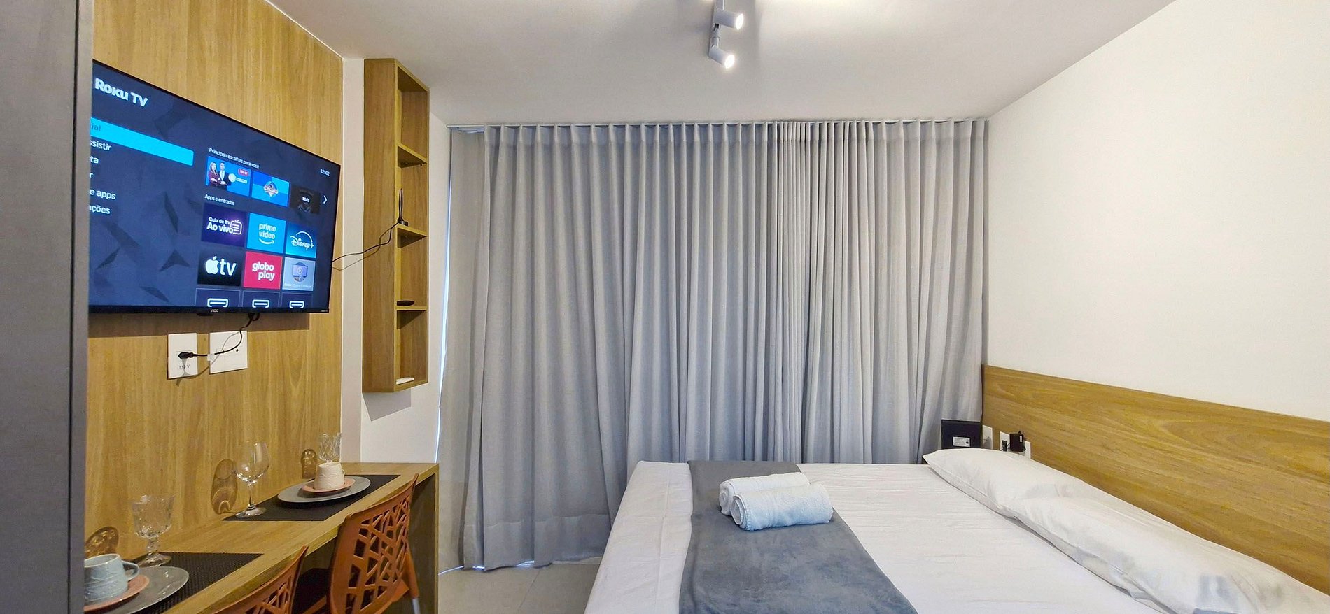- Espaço com cama casal, guarda-roupa, ar condicionado split, janela com cortina blackout, smart TV com canais locais, WI-FI, bancada com duas cadeiras, ferro de passar.