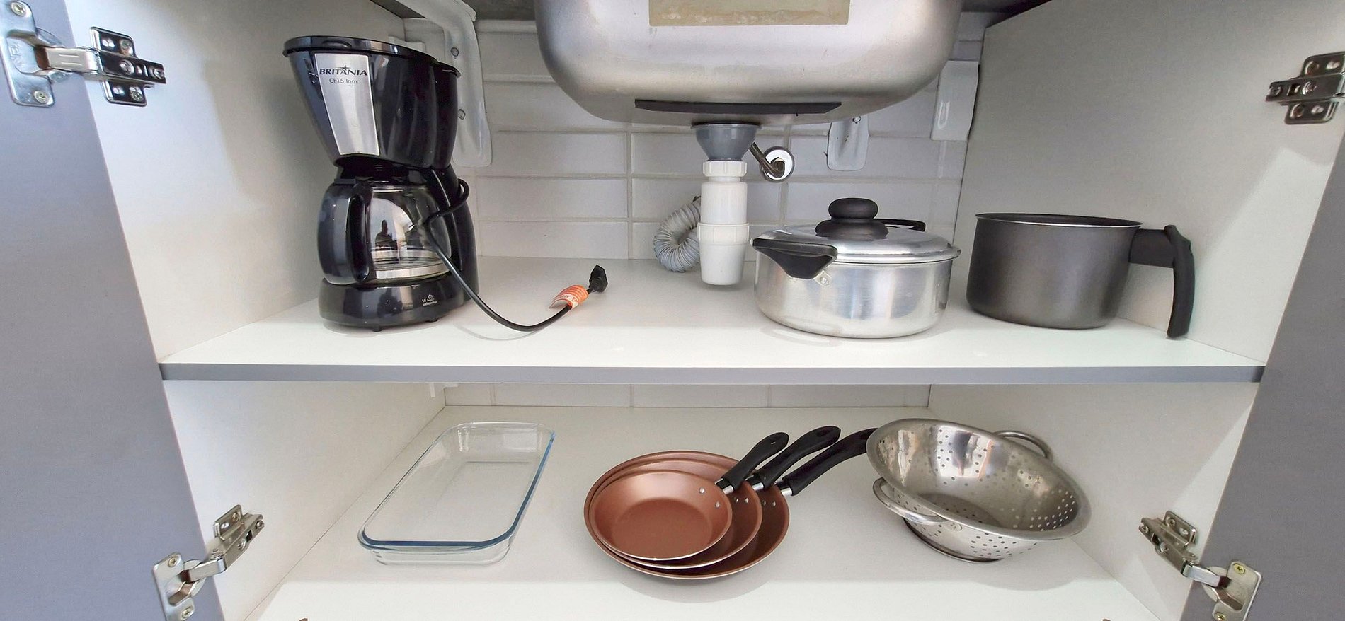 - Cozinha com sanduicheira, cafeteira elétrica, geladeira, mini-fogão elétrico portátil com duas chapas, liquidificador e acessórios de cozinha variados