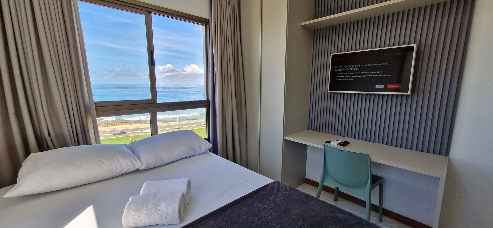 Suíte com vista total do mar, bem decorado no Costa Azul! Super ventilado, com cama casal, smart TV, ar condicionado split e cozinha completa. Condomínio com portaria 24hs, academia, piscina, co-working e lavanderia (paga à parte).