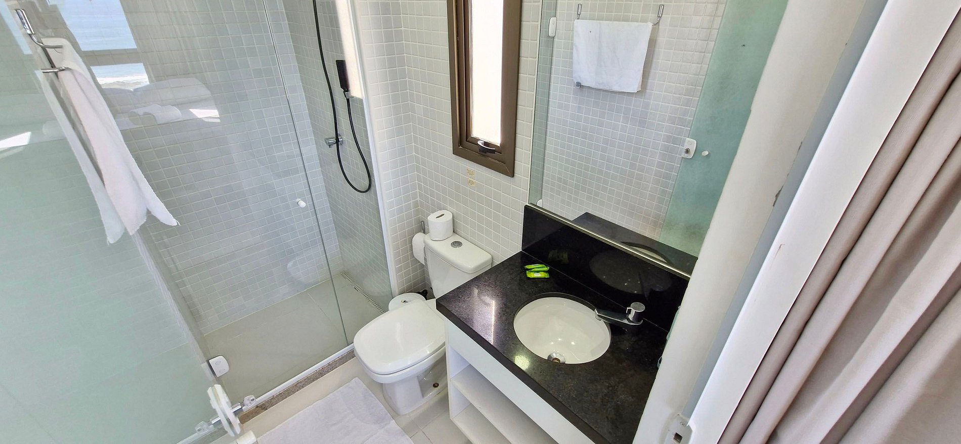 - Banheiro com chuveiro elétrico, box de vidro, pia com espelho e armário