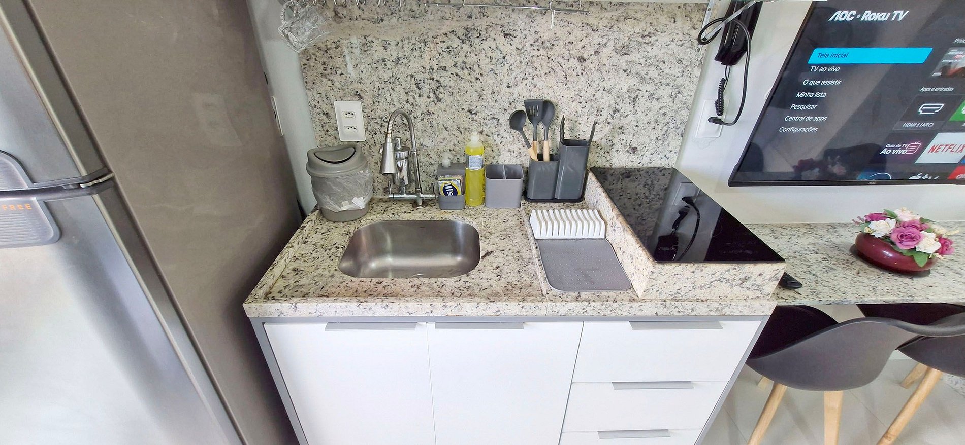 - COZINHA: geladeira duplex, sanduicheira, cafeteira elétrica, garrafa térmica, liquidificador, microondas, cooktop duas bocas de indução, filtro de água, panelas, talheres, copos, taças e acessórios de cozinha variados.