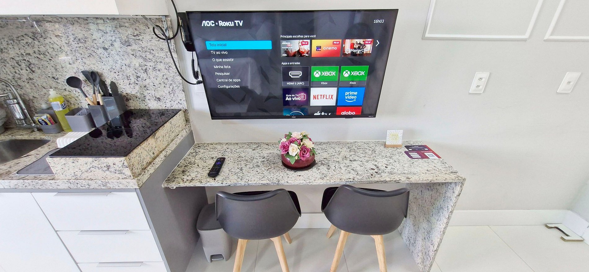 - SUÍTE: cama casal, guarda-roupa, ar condicionado split, bancada com cadeira, smart TV (apps e TV aberta), WI-FI, porta de vidro com cortina blackout, colchão dobrável para criança. BANHEIRO: armário, espelho, box, chuveiro elétrico e ferro de passar.