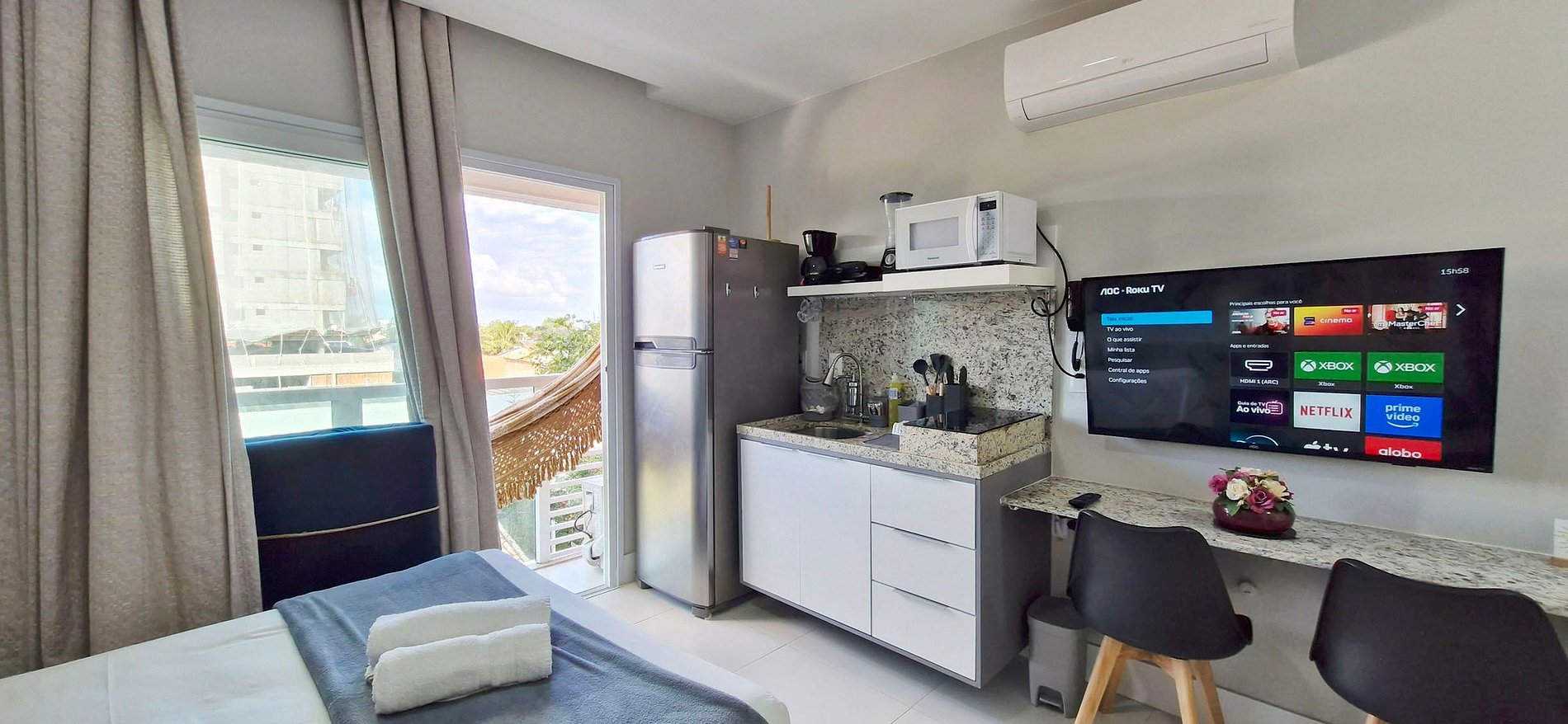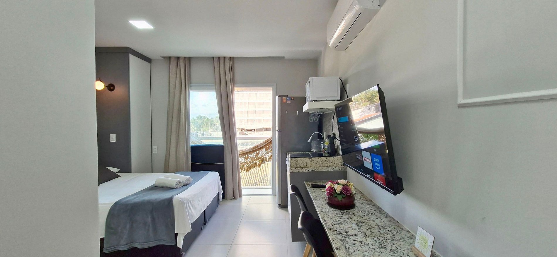 Apartamento com cama casal, colchão dobrável para criança, smart TV, ar condicionado split, WI-FI, cozinha, banheiro e varanda vista-mar.