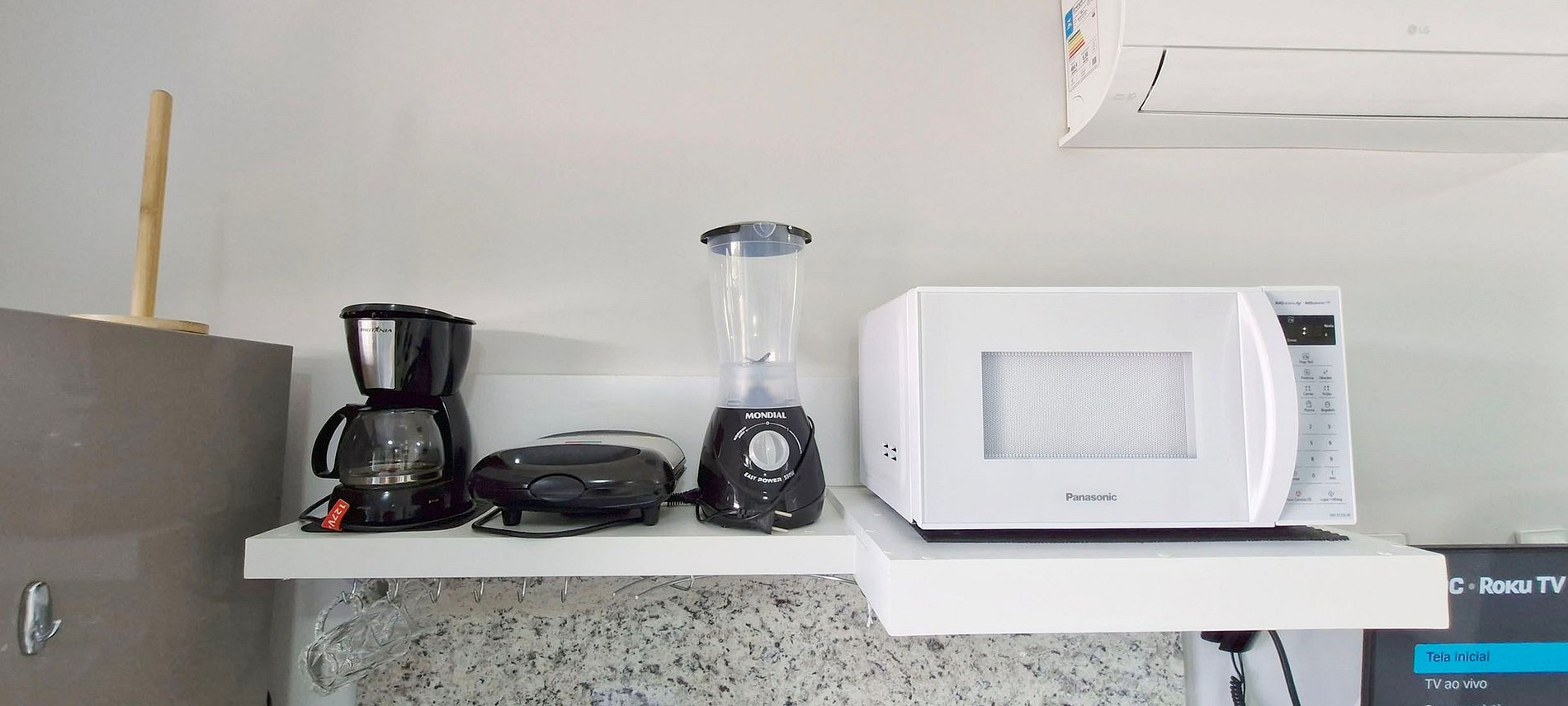 - COZINHA: geladeira duplex, sanduicheira, cafeteira elétrica, garrafa térmica, liquidificador, microondas, cooktop duas bocas de indução, filtro de água, panelas, talheres, copos, taças e acessórios de cozinha variados.
