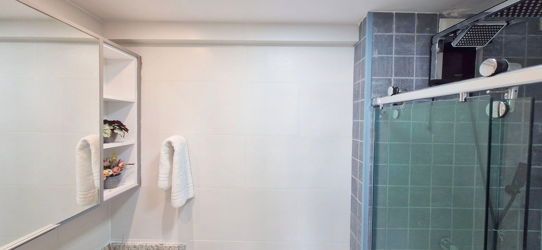 - SUÍTE: cama casal, guarda-roupa, ar condicionado split, bancada com cadeira, smart TV (apps e TV aberta), WI-FI, porta de vidro com cortina blackout, colchão dobrável para criança. BANHEIRO: armário, espelho, box, chuveiro elétrico e ferro de passar.