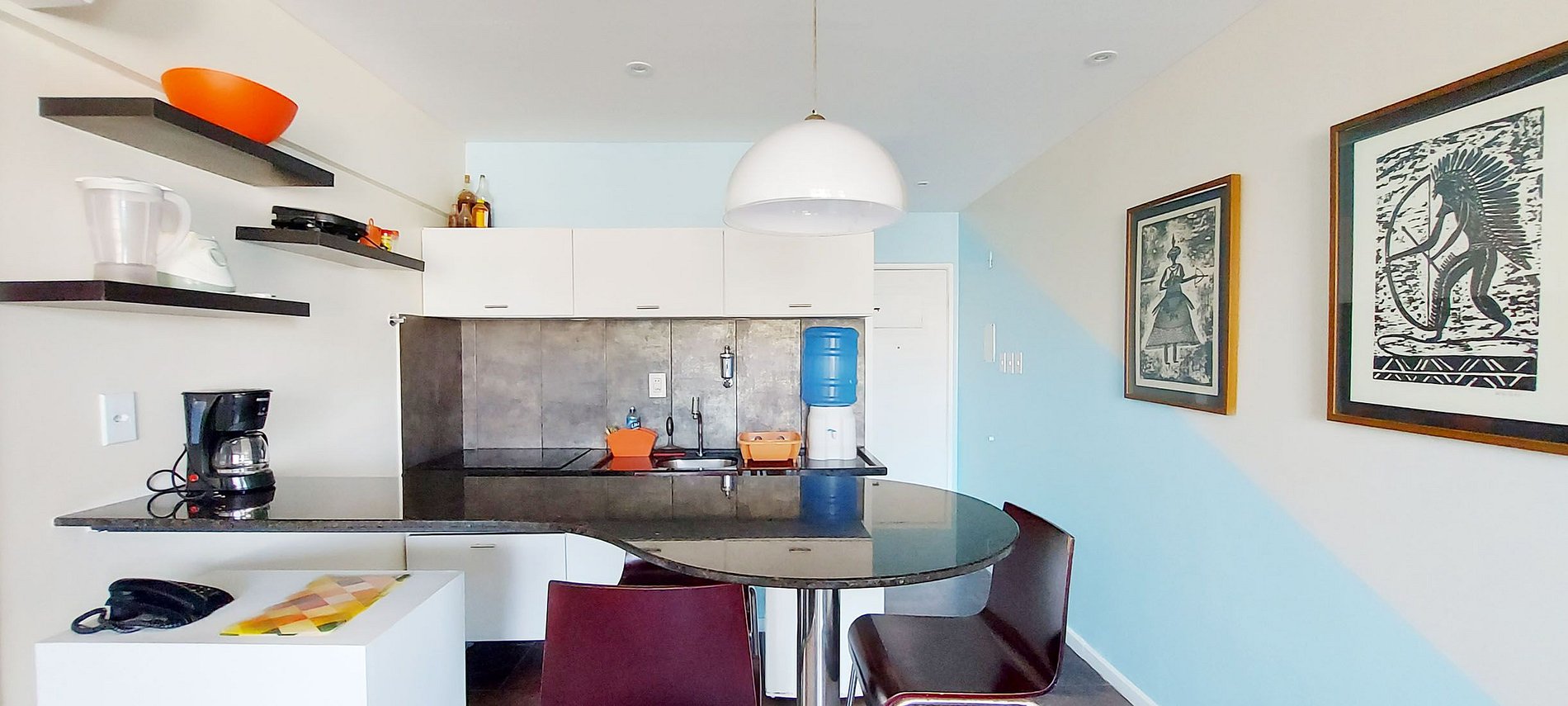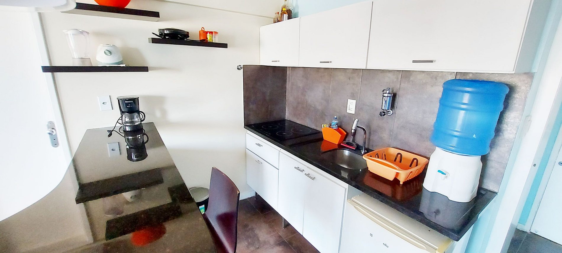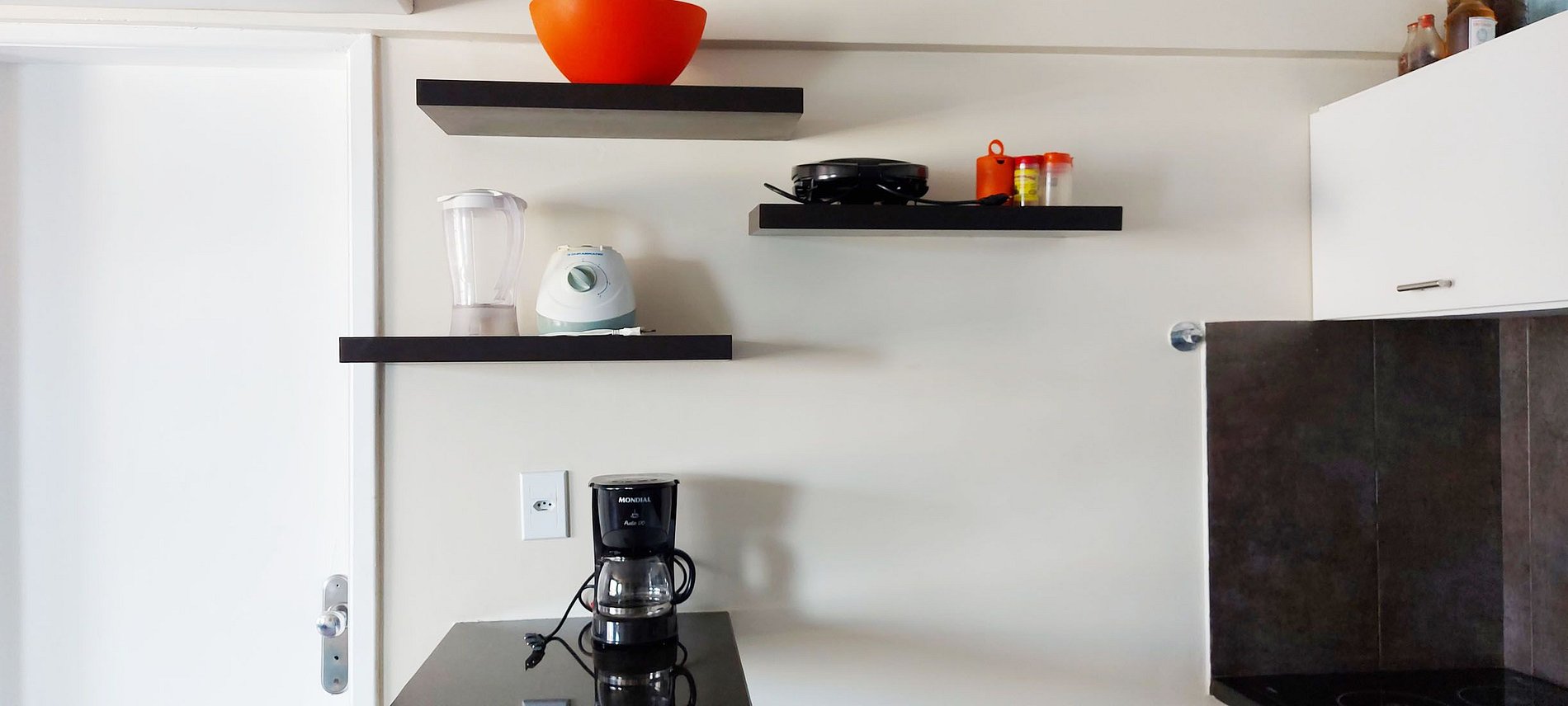 - Cozinha com frigobar, microondas, cooktop 2 bocas, cafeteira elétrica, liquidificador, sanduicheira, filtro de água, galão disponível para quem preferir comprar água, itens básicos e acessórios de cozinha