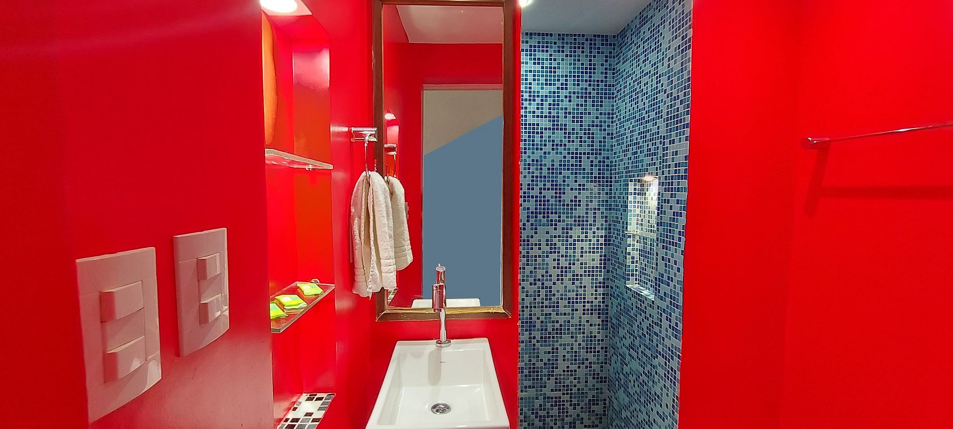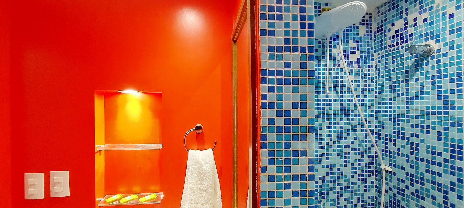 - Banheiro com chuveiro elétrico e espelho