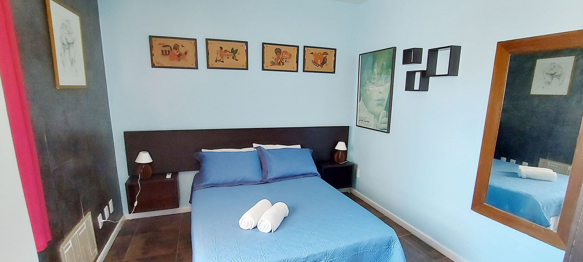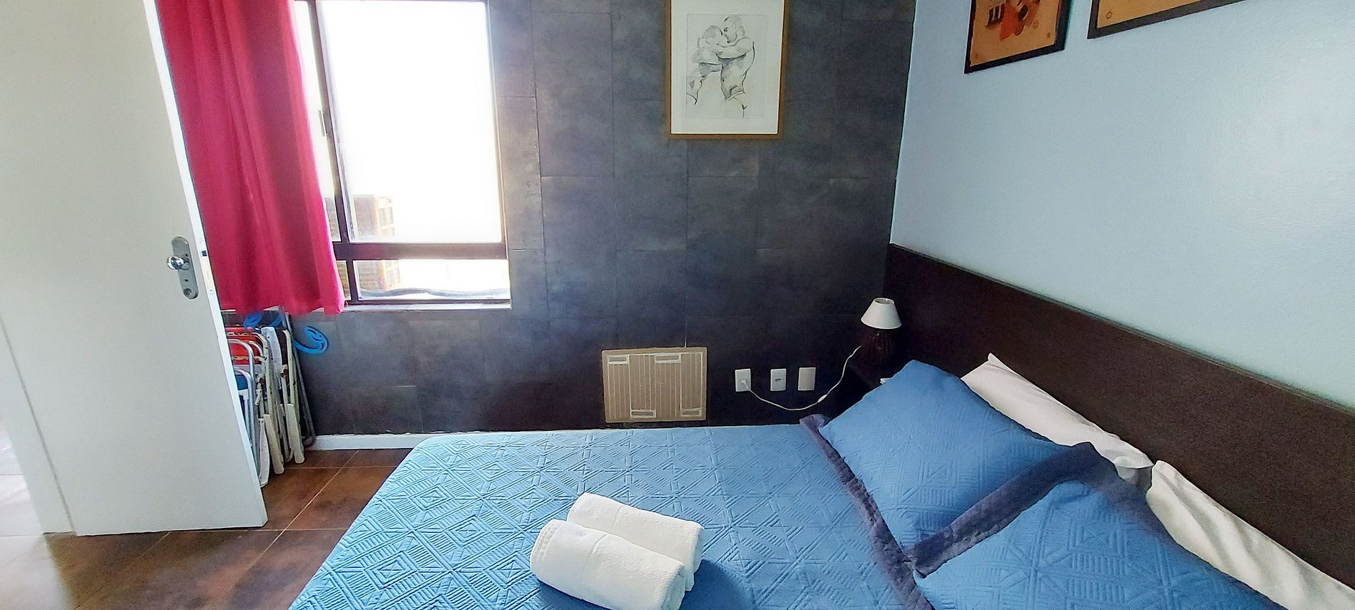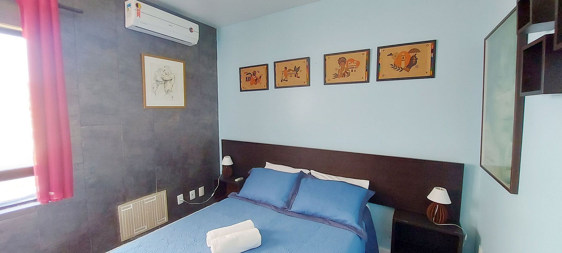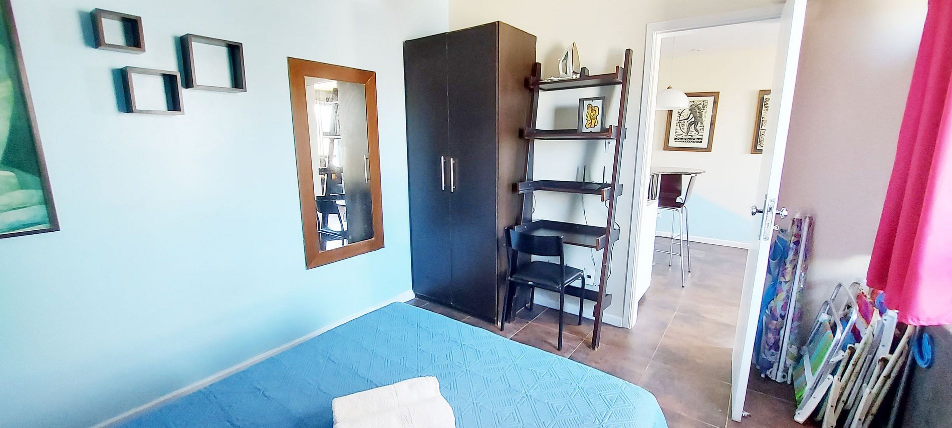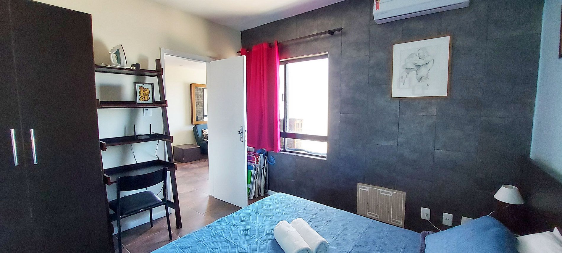 - Quarto com cama de casal, 2 abajures ao lado da cama, espelho, guarda-roupa, estante com prateleira para trabalhar e cadeira, ferro de passar, ar condicionado split, 2 cadeiras de praia