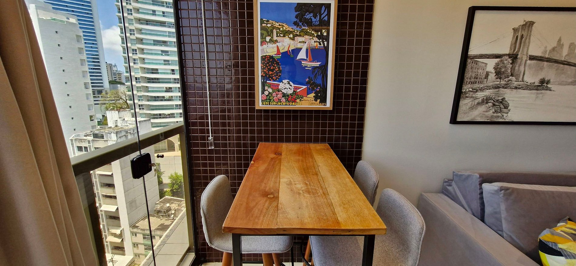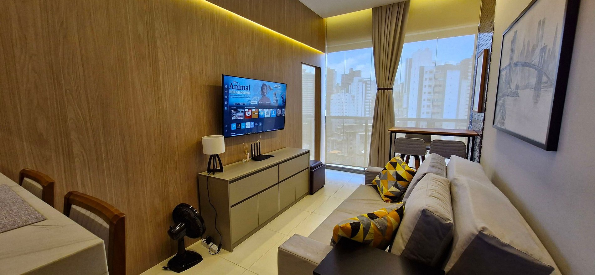 - SALA: sofá, ar condicionado de teto, cortina blackout, mesa com 3 cadeiras, abajur, rack, smart TV (apps e TV aberta), WI-FI