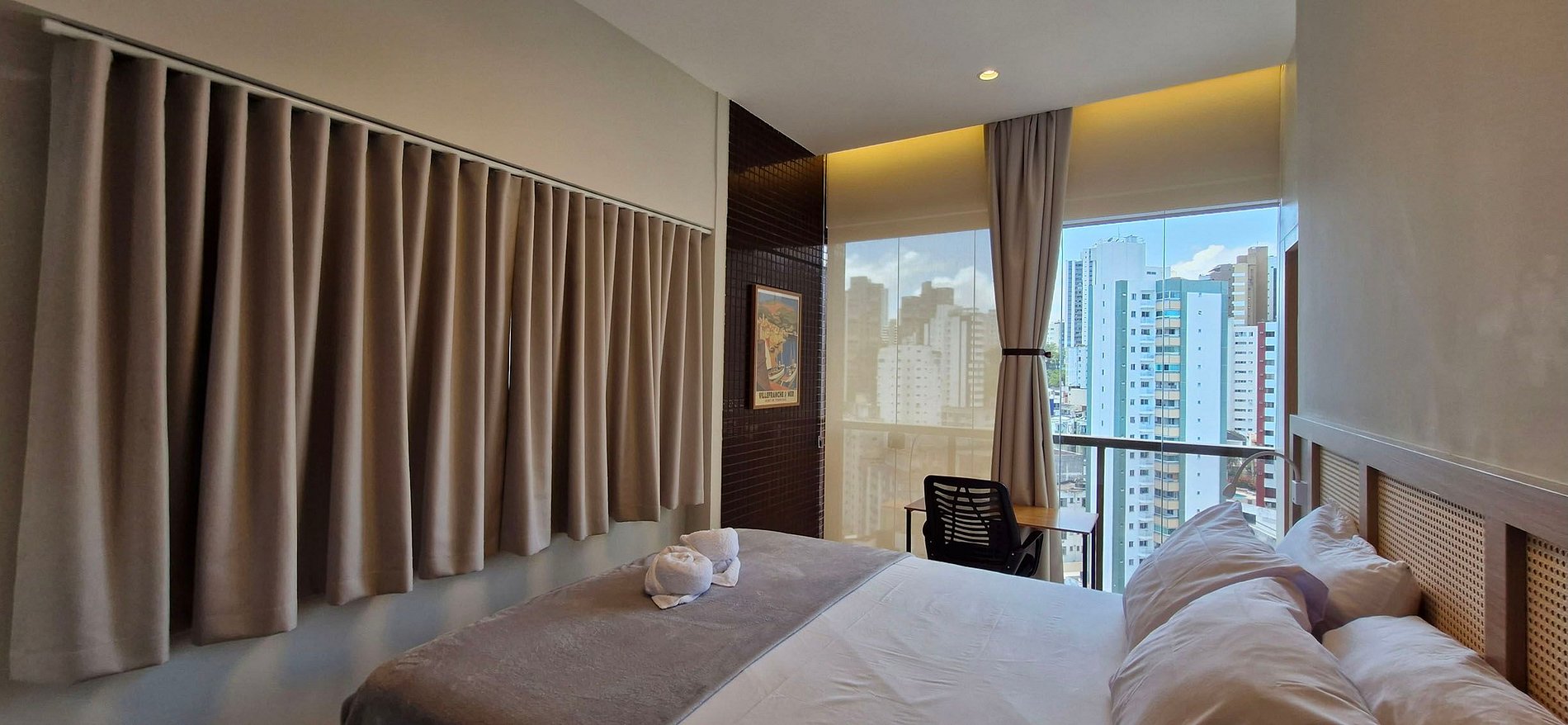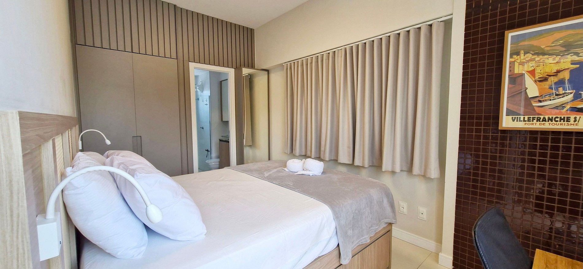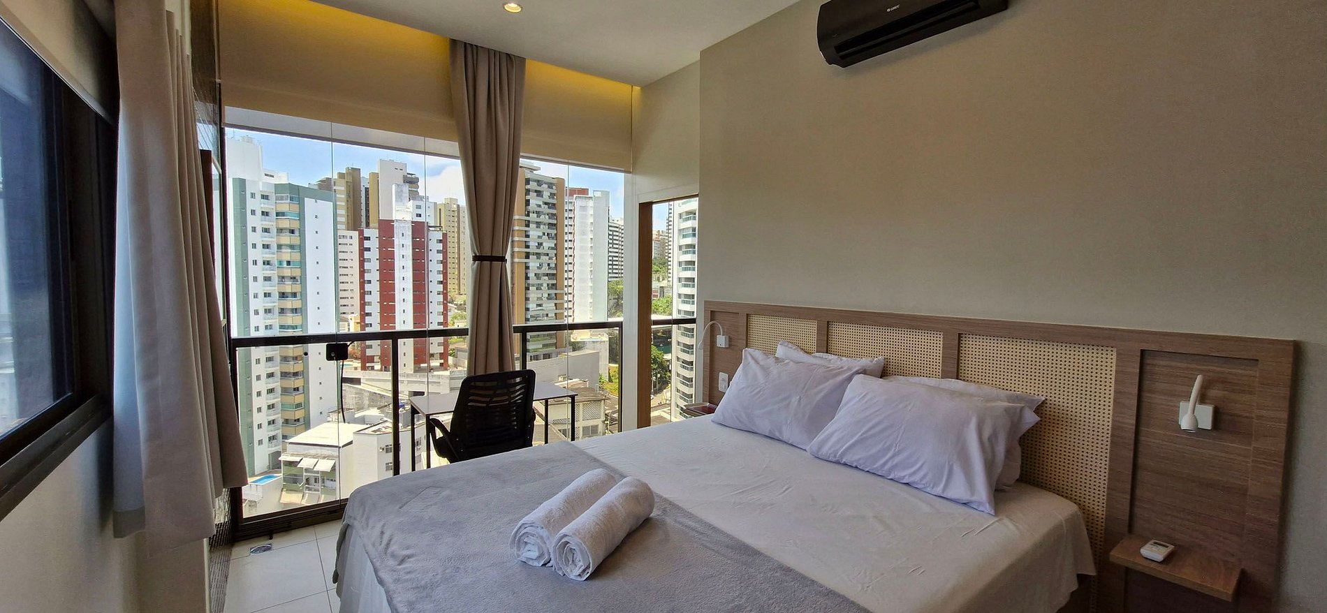 - SUÍTE: cama casal, guarda-roupa, ar condicionado split, mesa de trabalho com cadeira, janela com cortina blackout