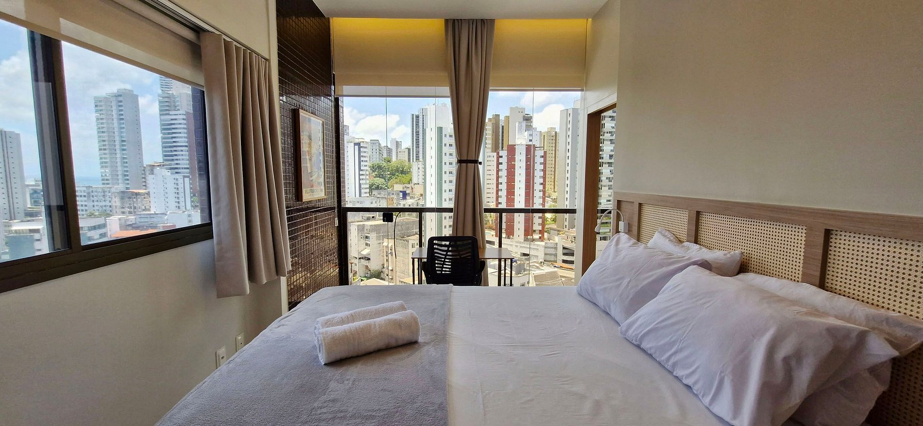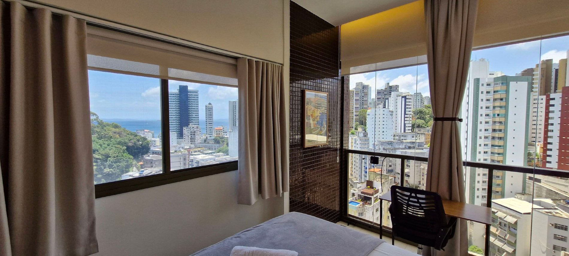 Lindo apartamento quarto e sala em rua tranquila e super bem localizada. A 800m da praia do Porto da Barra, 700m do Hospital Português e 1 km do Shopping Barra! Sala de estar com ar condicionado de teto, sofá, mesa e cadeiras, SMART TV, WI-FI, suíte com cama de casal, mesa de trabalho e ar condicionado split, cozinha completa. Prédio com piscina na cobertura, academia, sala de coworking, garagem rotativa e recepção 24hs. Inesquecível!