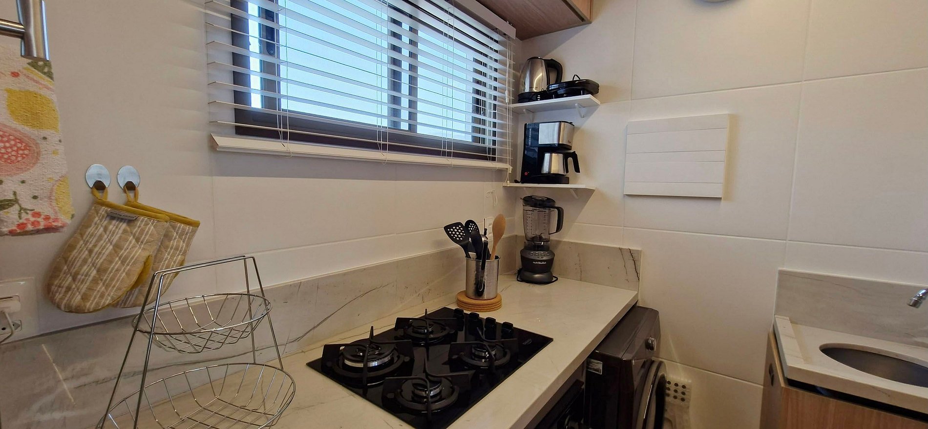 - COZINHA: cooktop 4 bocas, forno elétrico, microondas, filtro de água (embaixo da pia), bancada com 2 cadeiras altas, sanduicheira, cafeteira elétrica, geladeira duplex, garrafa térmica, liquidificador, panelas, potes, copos, taças e acessórios de cozinha variados. Área de serviço com pia, máquina lava e seca, escadinha, varal de chão, ferro e tábua de passar