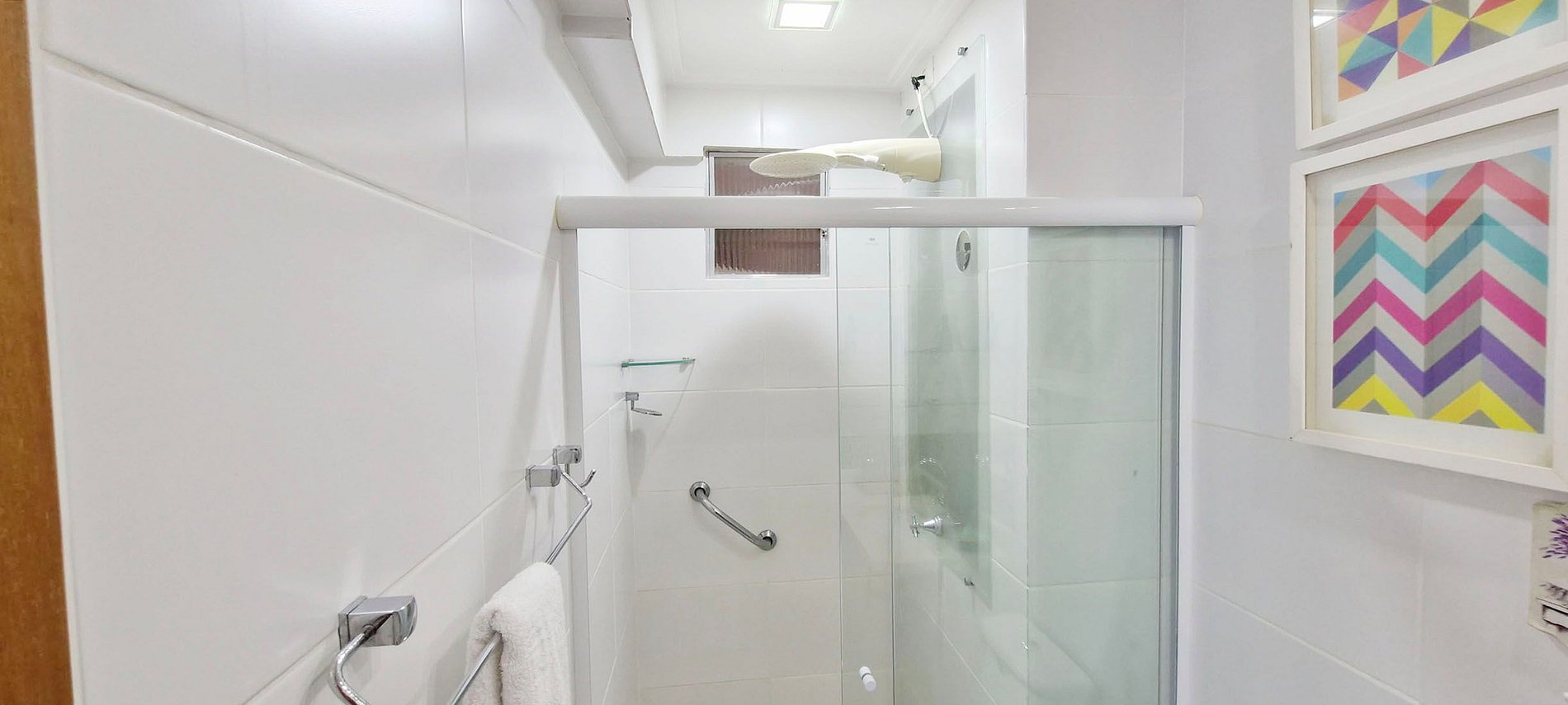 - Suíte com cama casal, mesinha de cabeceira com gavetas, guarda-roupa, ferro de passar, ar condicionado split, cortina (não é blackout), espelho grande, circulador de ar, 2 cadeiras. BANHEIRO com box, pia, espelho e chuveiro elétrico. (A porta do banheiro é de blindex, veja nas fotos)