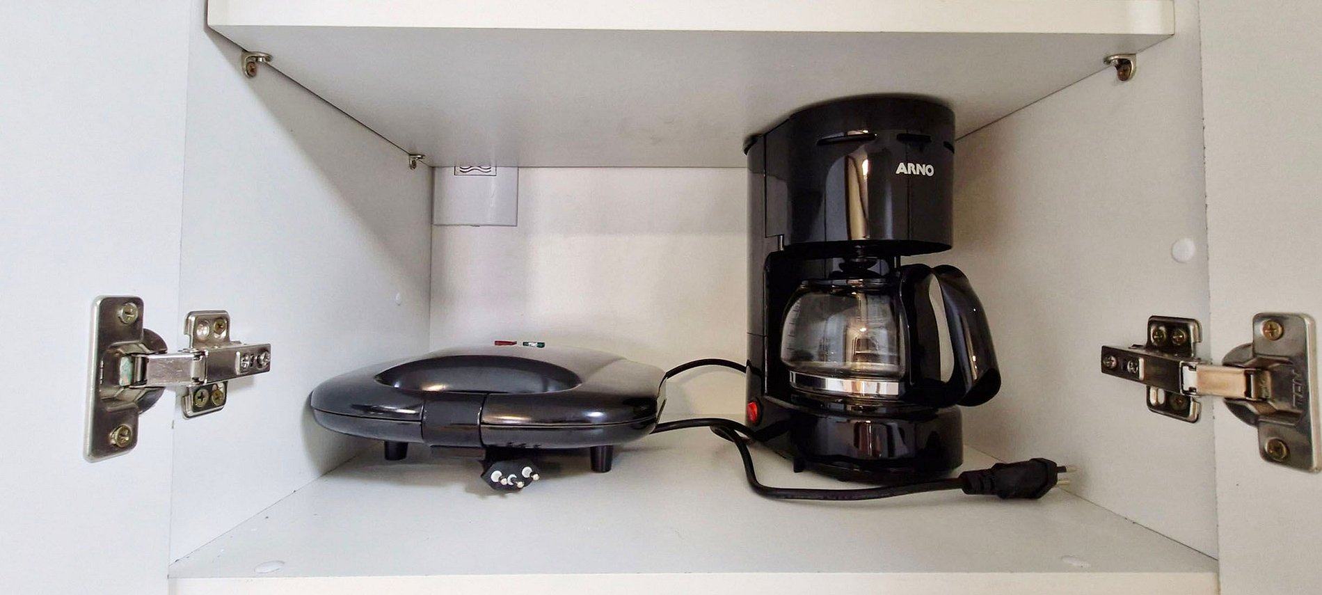 - Cozinha com liquidificador, sanduicheira, cafeteira elétrica, geladeira duplex, cooktop 2 bocas de indução, microondas, filtro de água, acessórios de cozinha variados