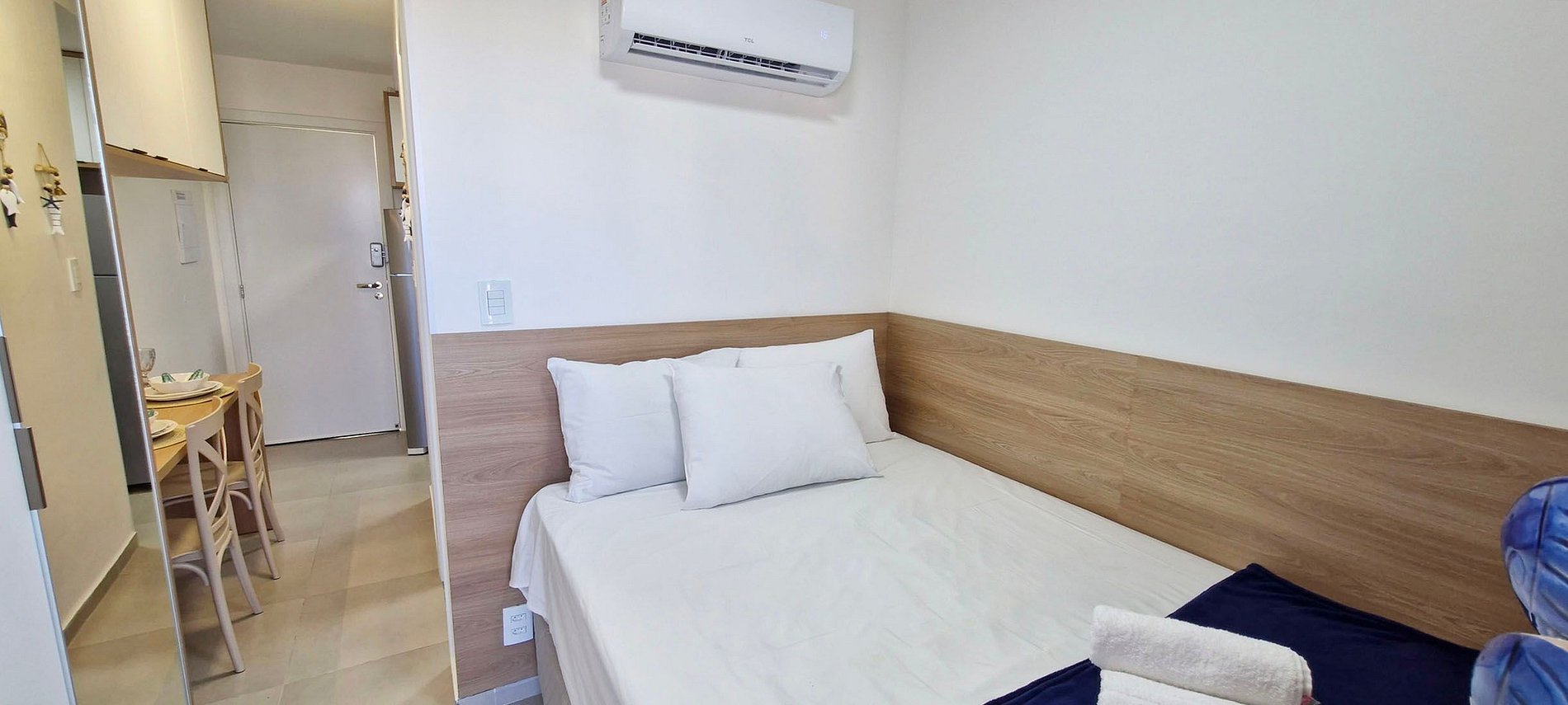 Com cama de casal, smart TV, WI-FI, ar-condicionado split, ferro de passar. Cobertura com piscina e academia, coworking e lavanderia com pagamento à parte. Vaga de garagem rotativa. Recepção 24hs.