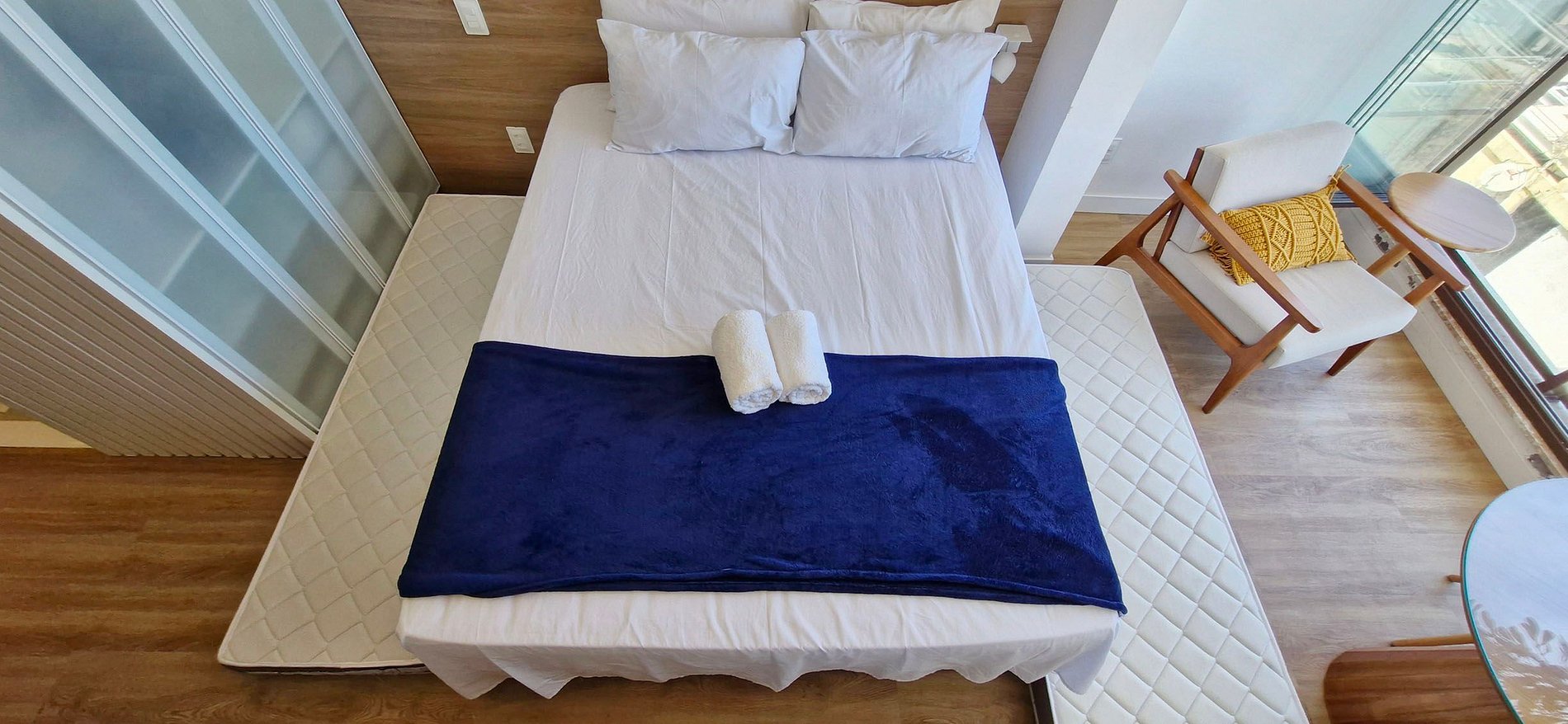- Espaço com cama queen, guarda-roupa, ar condicionado split, janela com cortina blackout, smart TV com canais locais, WI-FI, mesinha redonda com 3 cadeiras, ferro de passar.