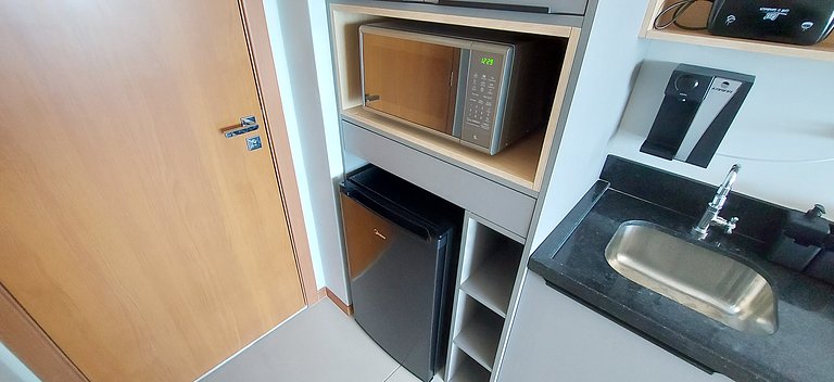 - Cozinha com sanduicheira, cafeteira elétrica, frigobar, filtro de água, garrafa térmica, liquidificador, fogão duas bocas de indução, e acessórios de cozinha variados