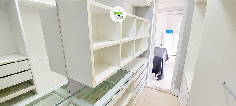 - Suíte com cama queen, mesinha de canto com abajur, closet espaçoso, ar condicionado split, cortina blackout, banheiro com box, ferro de passar, espelho e chuveiro elétrico
