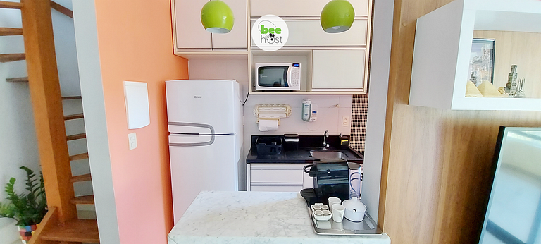 - Cozinha com geladeira duplex, microondas, filtro de água, fogão 4 bocas, cafeteira de cápsula (traga a cápsula de sua preferência), liquidificador, garrafa térmica, pratos, copos, taças, talheres e panelas.