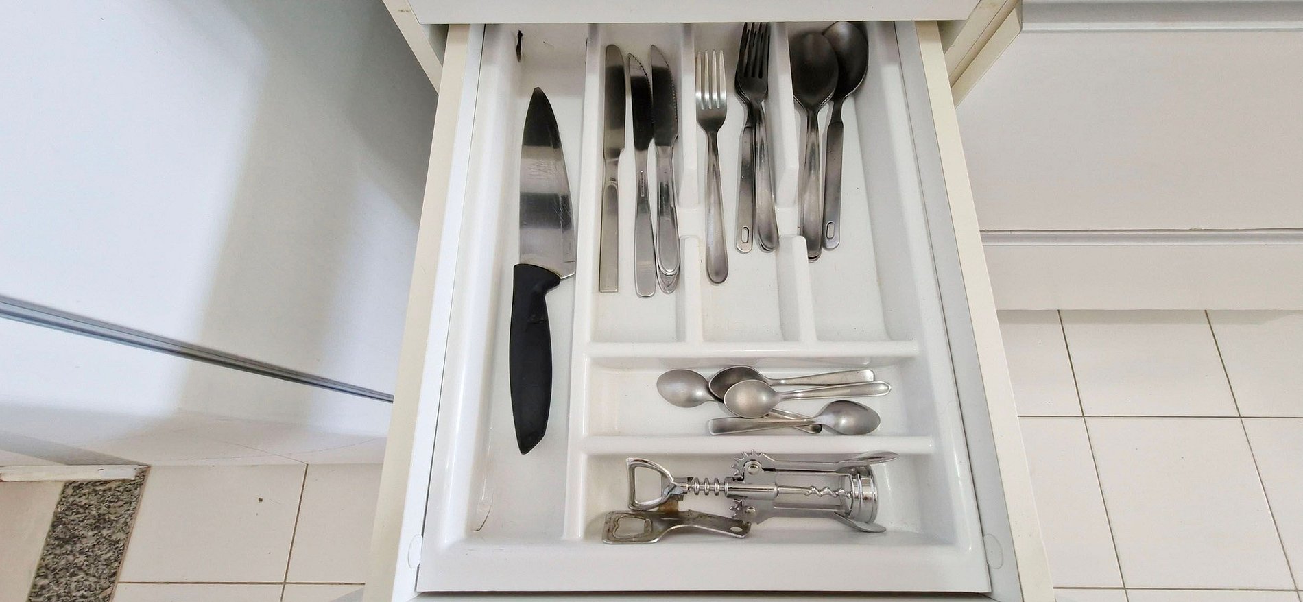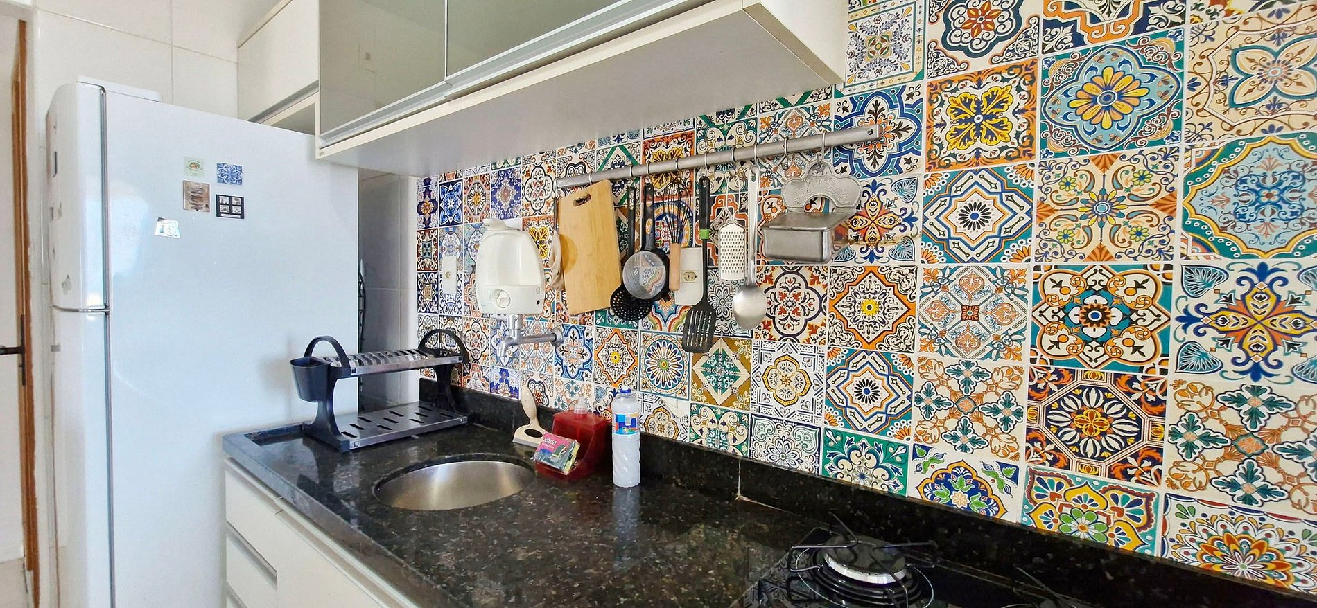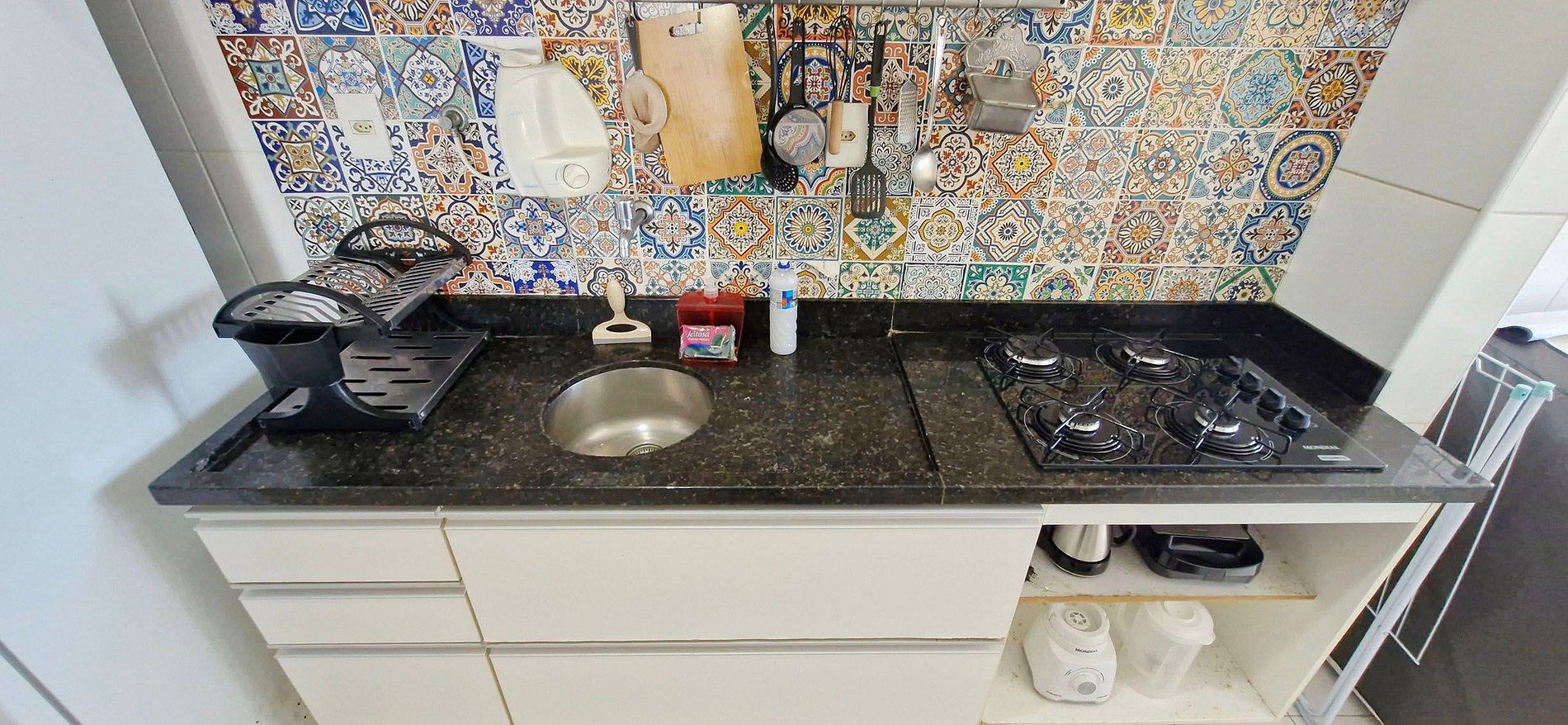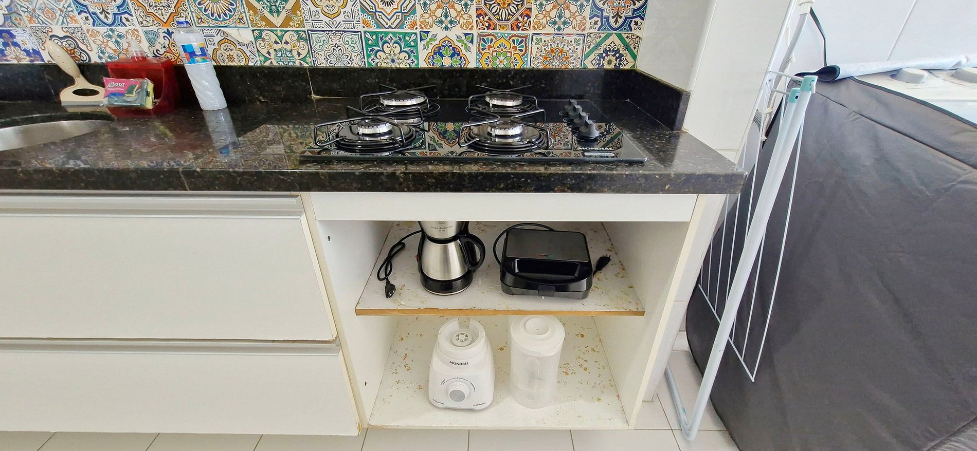 - Geladeira duplex, cooktop 4 bocas a gás, sanduicheira, cafeteria elétrica, garrafa térmica, liquidificador, filtro de água, microondas, talheres, panelas e acessórios de cozinha variados