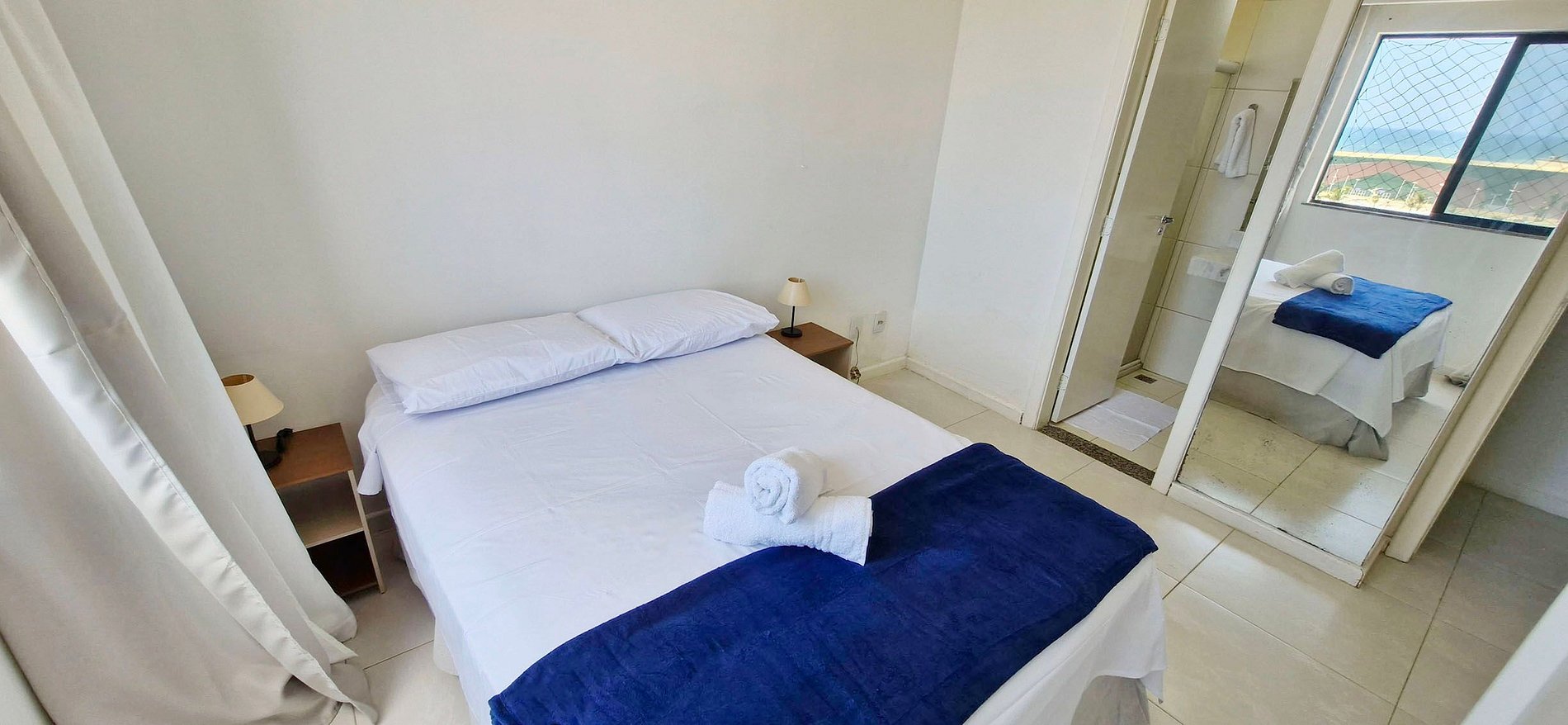 - Cama de casal, guarda-roupa grande, ar condicionado split, 2 mesas de cabeceira com abajur, cortina (Não é blackout), tela de proteção. BANHEIRO com armário, espelho, box, chuveiro elétrico