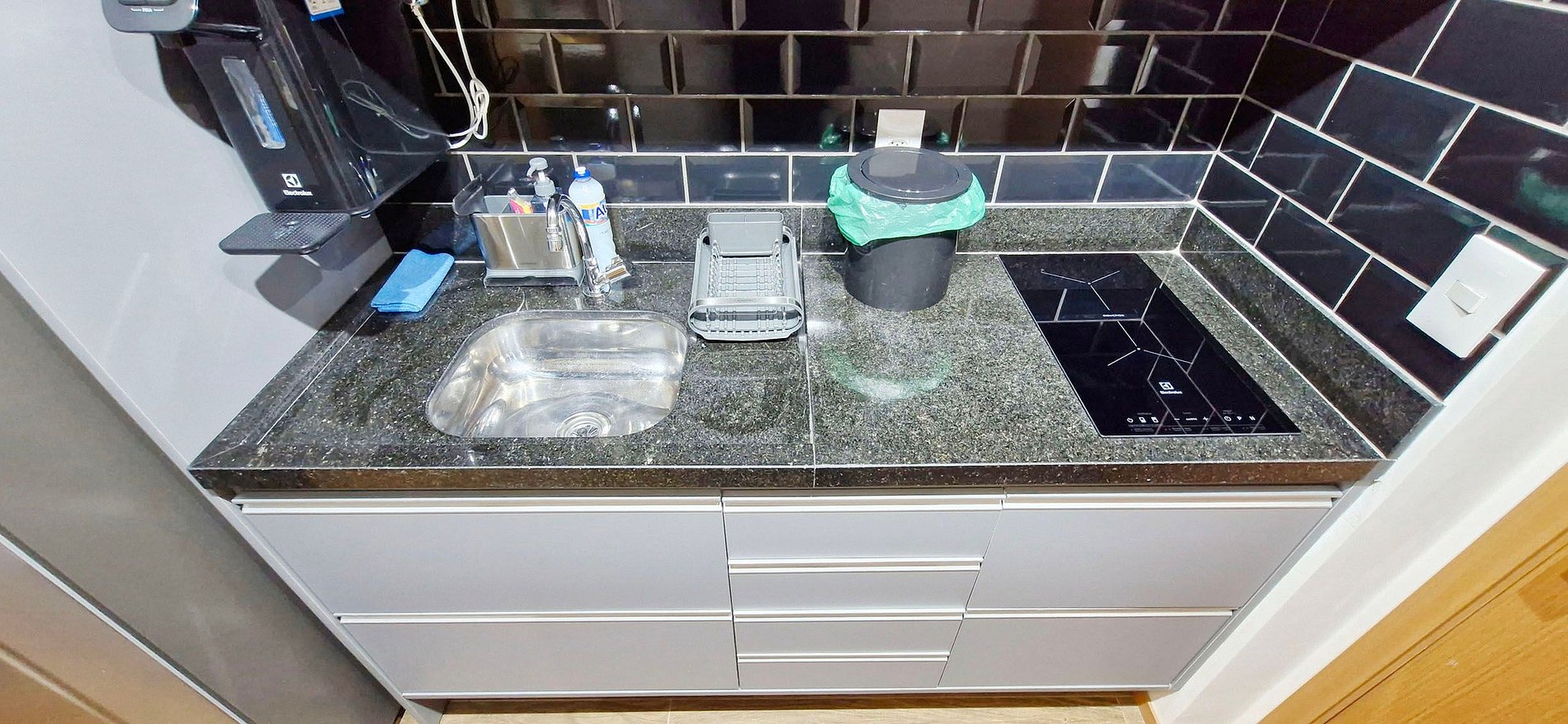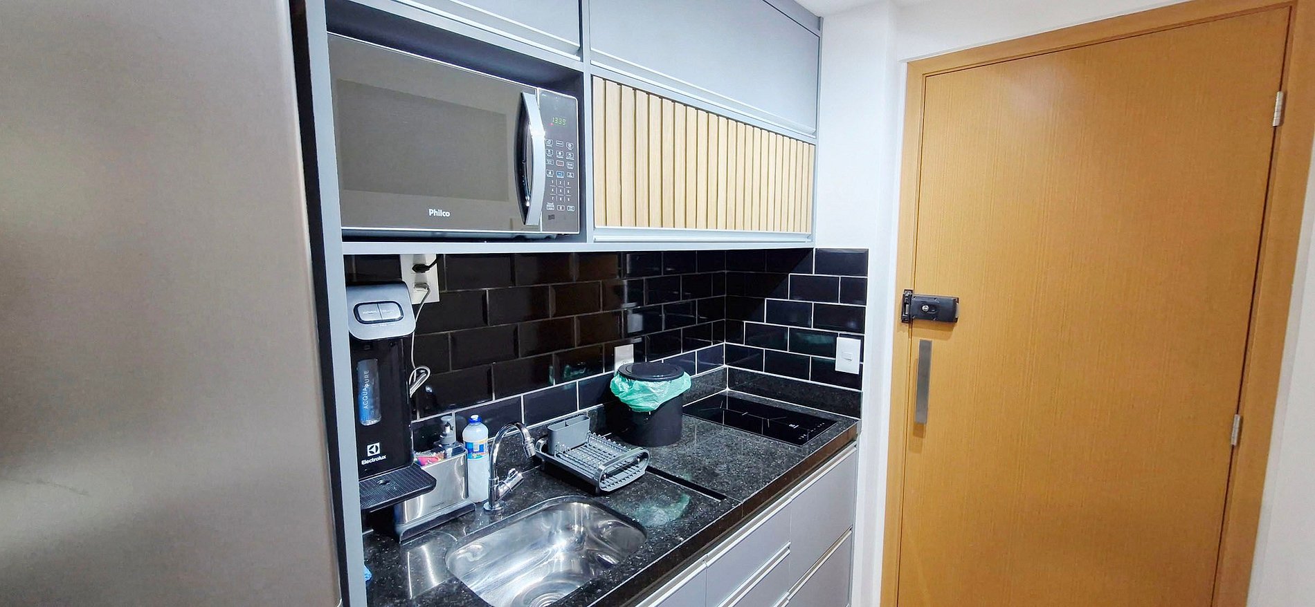 - COZINHA: sanduicheira, cafeteira elétrica, geladeira duplex, garrafa térmica, liquidificador, microondas, cooktop duas bocas de indução, filtro de água, panelas, talheres, copos, taças e acessórios de cozinha variados