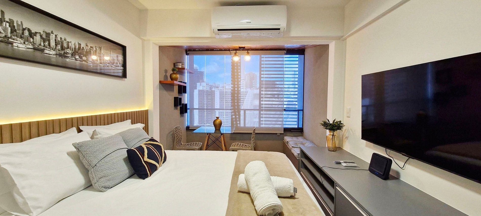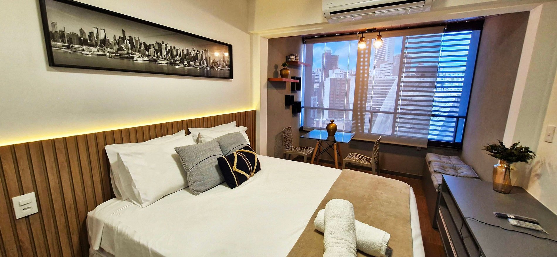 - QUARTO: cama casal, guarda-roupa com espelho grande, ar condicionado split, banco largo, cabeceira com luz de LED, janela Reikki com cortina (NÂO É BLACKOUT), rack com smart TV (apps e TV aberta), WI-FI, mesa com 2 cadeiras